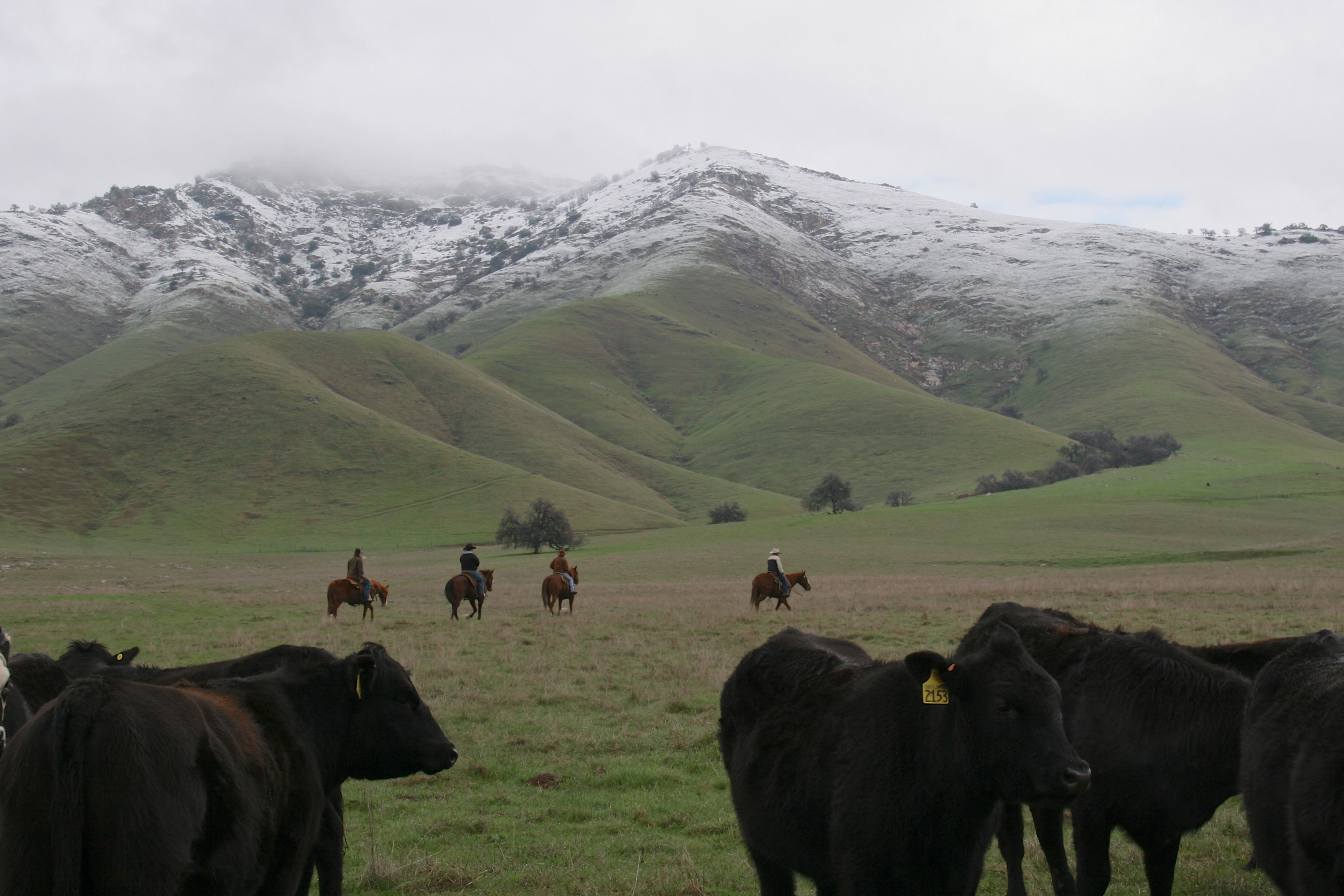 There are no weekends off this time of year as we juggle days around the weather, neighbors’ brandings and our own, trying get the work done. Low snow down to about 1,000 feet with the last cold front that brought 0.62” of welcome rain, we gathered the Wagyu bulls yesterday for their return to Snake River Farms in Idaho, for their TB tests and Health Certificates before they leave California.