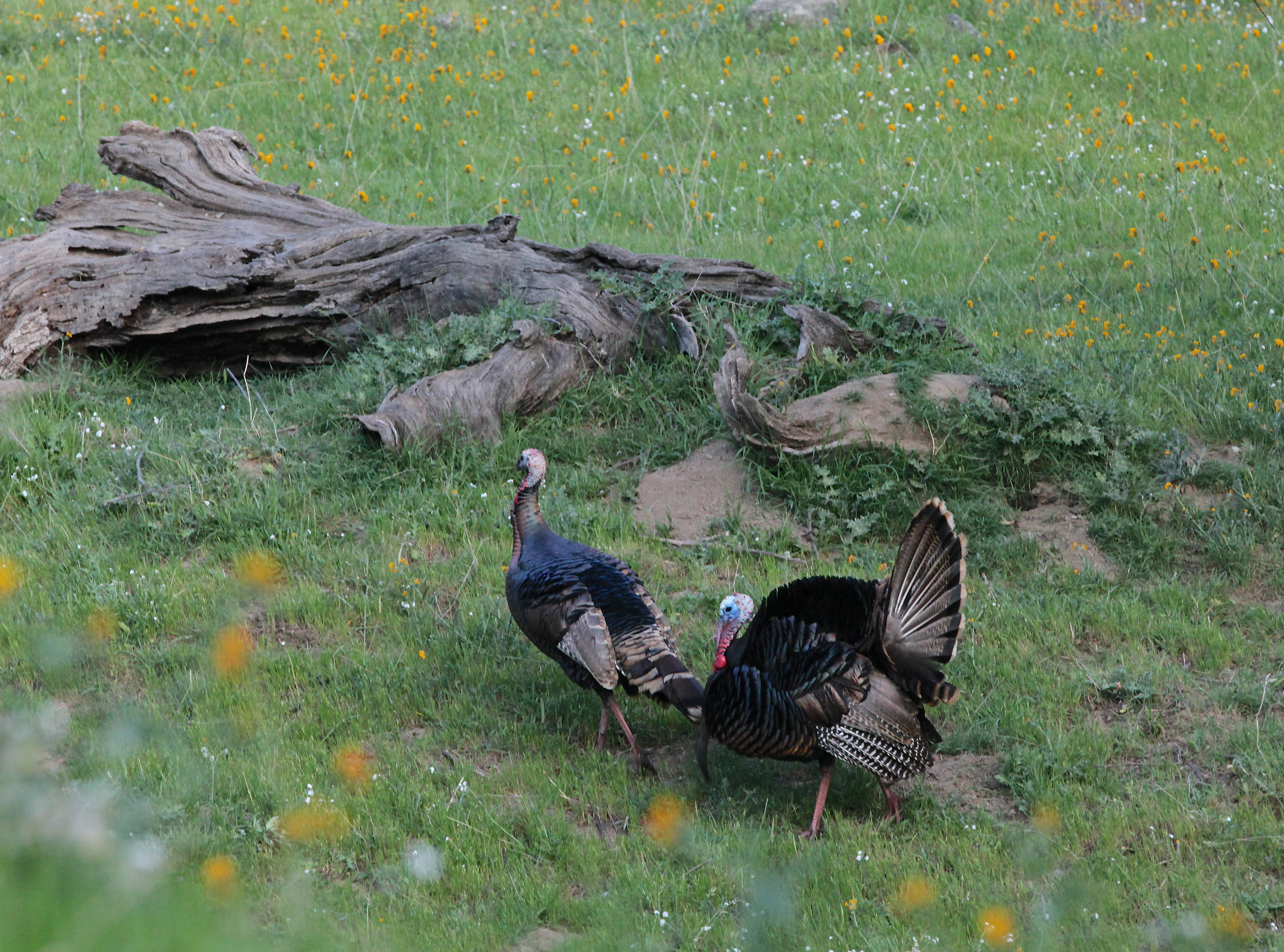 Toms up-early, fanned and dragging feathers