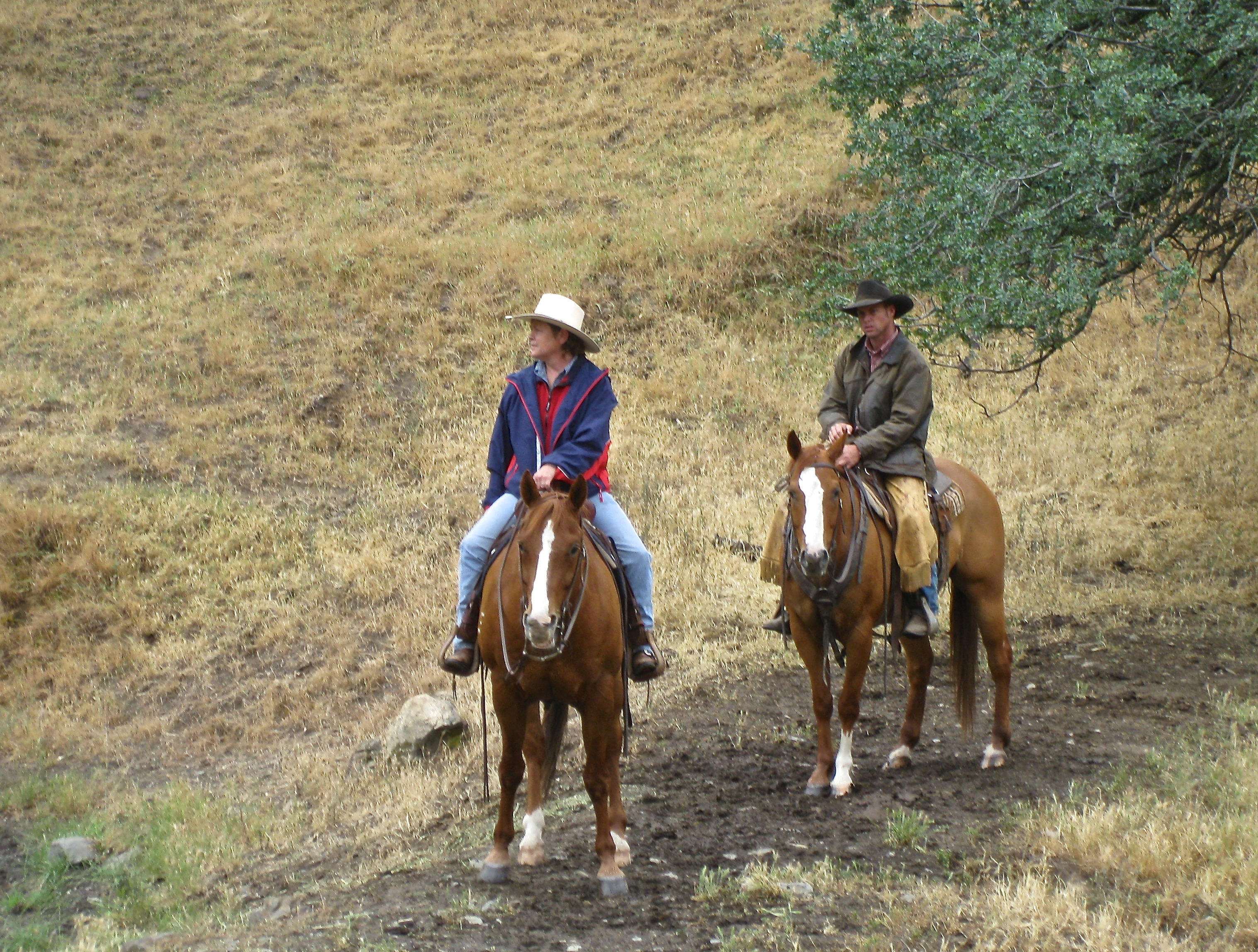 Robbin and Douglas Thomason on Bart and Twist waiting while the heifers drank.