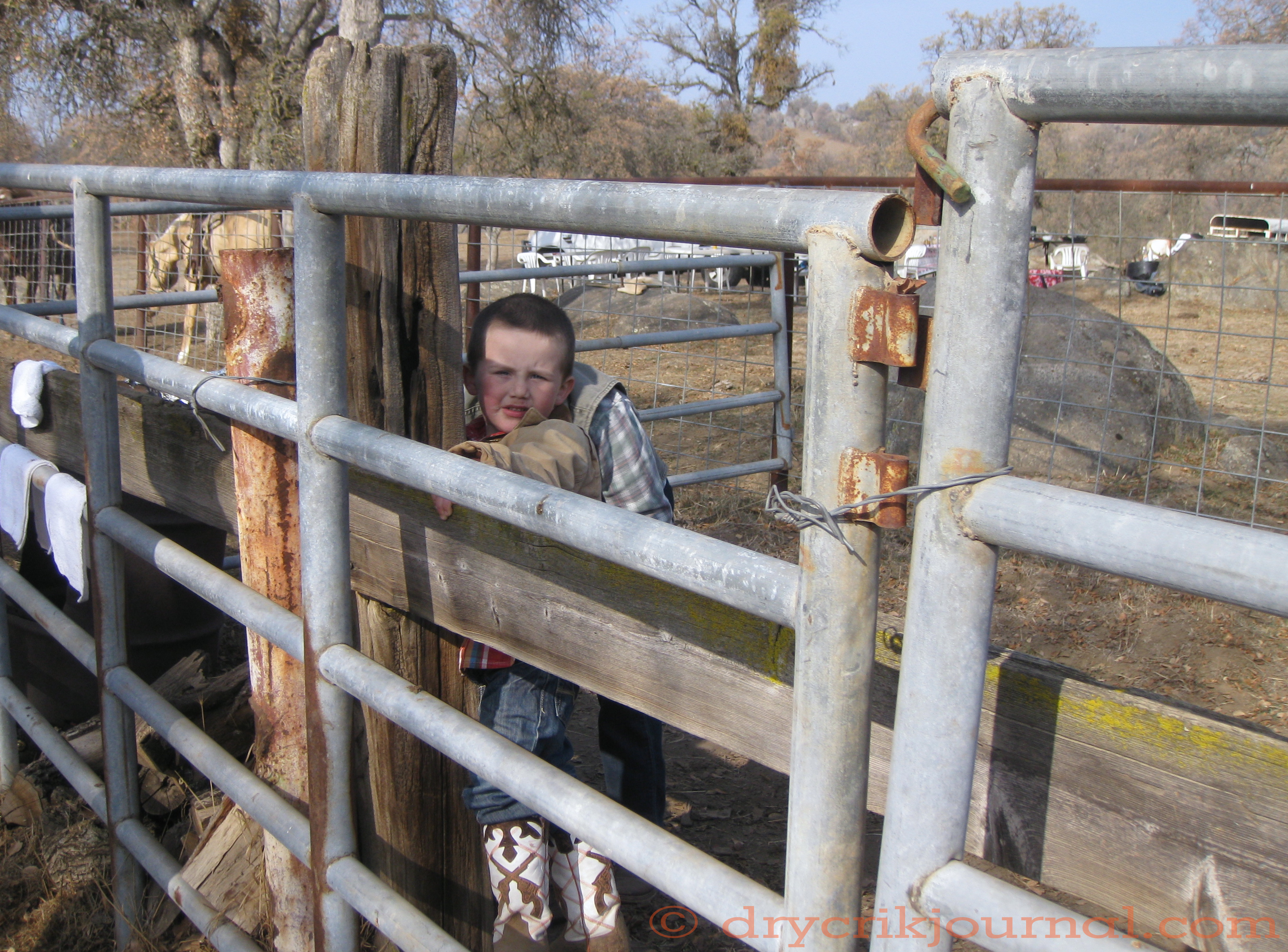• Thanks so much, Dina. Up since 5:00 a.m., Wade was fading near the end of the branding when Robbin got this shot of him looking into the pen, all done wanting to help while his mother vaccinated calves.
