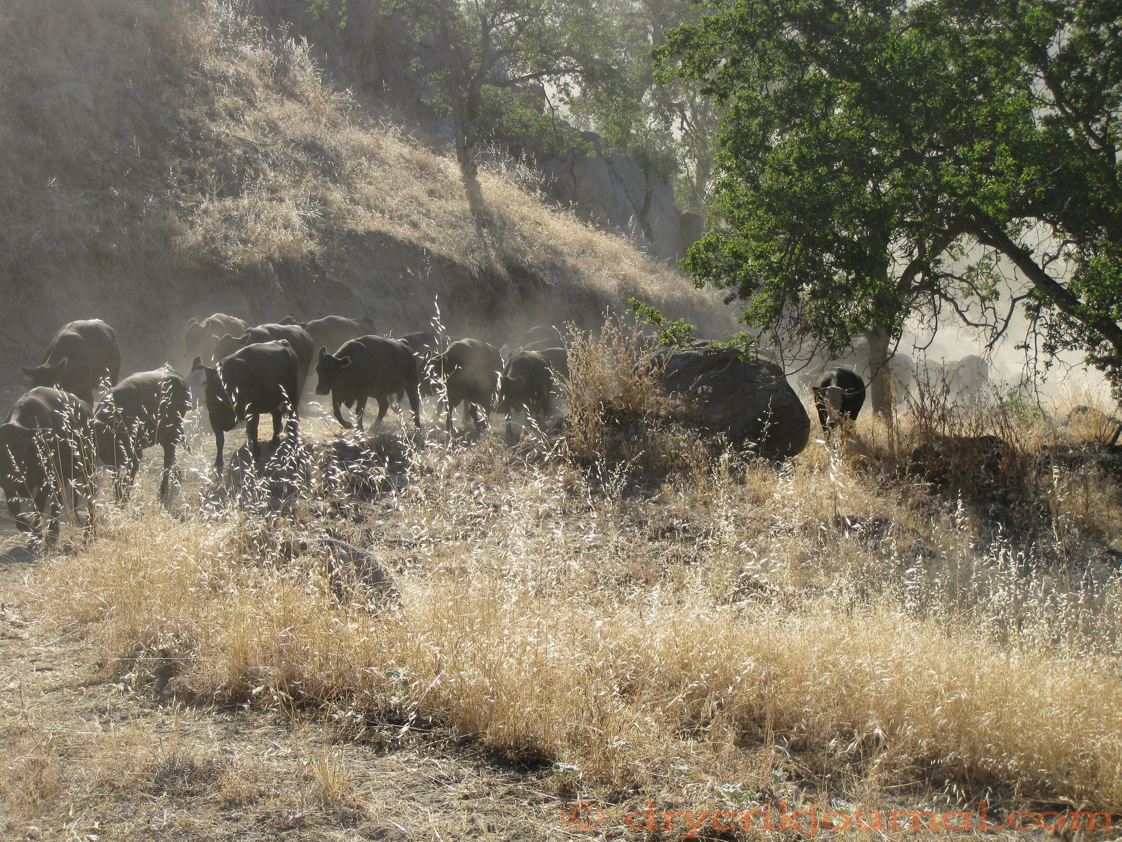 • Under the tree limb between the branches and in the open space between the last two cows: a cowboy silhouette that I think is Robbin. In the Kubota just ahead of the cattle when I took this shot, we’ve found that many times it’s easier on everyone to lead the cattle rather than drive them. With their calves weaned and down the mountain for five or so days, these girls know the routine and are ready to get back home to the luxury of having only to take care of themselves. Thanks for visiting, Bev, and for drawing further explanation from me.