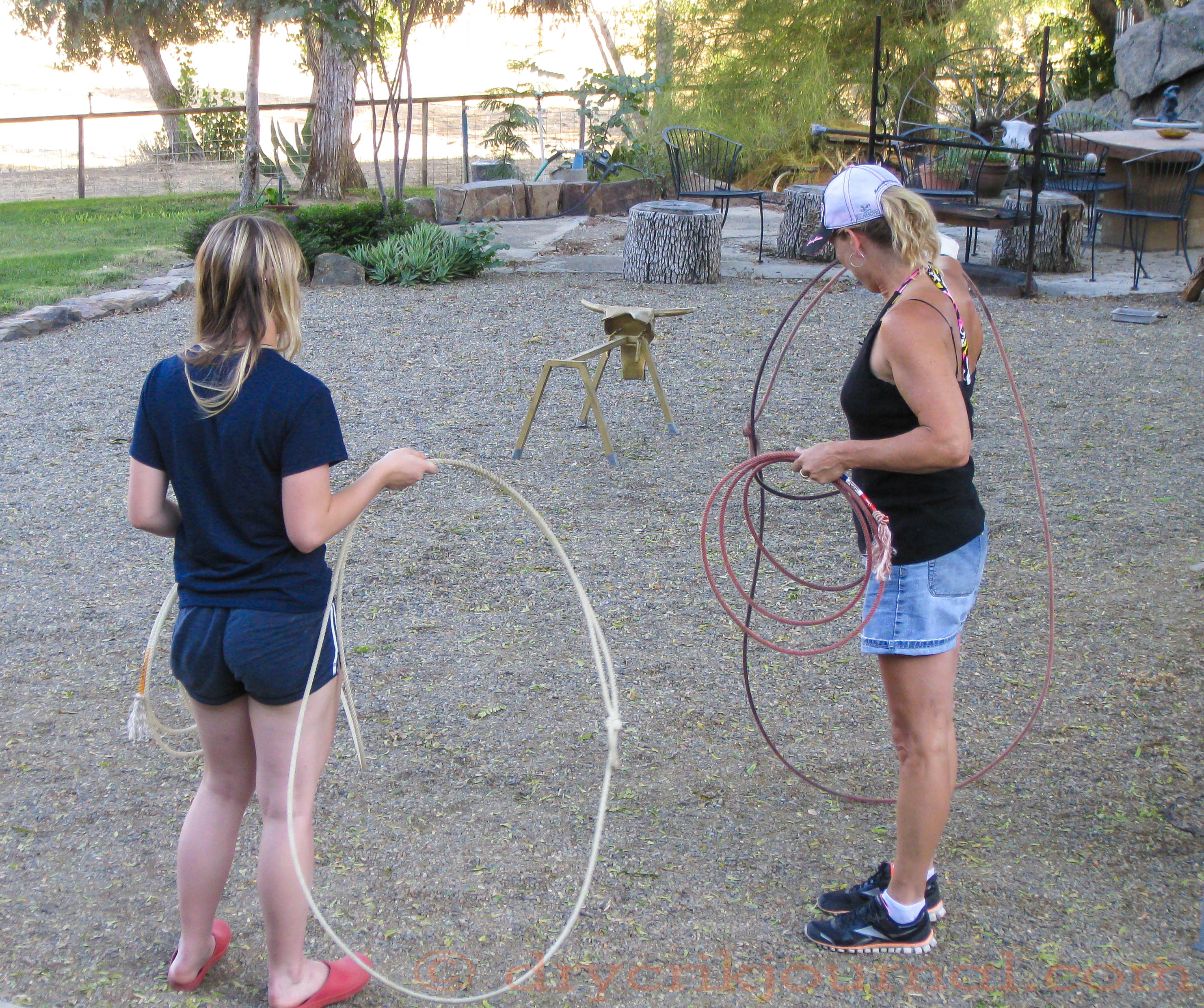 None of the girls seemed opposed to having a little party yesterday now that our cattle work was done. Allie Fry, who is heading off to Fresno State next week, wanted to learn to rope and Terri Blanke, who coaches the youngsters before the Three Rivers Lions Club Team Roping, is helping her with the basics that evolved into a competition that included Robbin and I. An athletic quick study, Allie surprised us all.
