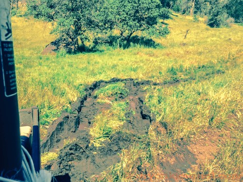 Short of boasting this year, we’ve been fortunate not to have gotten stuck somewhere on the ranch considering our many close calls and all the ‘stuck’ stories we’ve heard from our neighbors. Sharing her iPhone photos, Robbin was quick to refine the definition of being stuck as when you have to walk home, or call someone to pull you out of a mud hole. Down on its frame, luckily they found an oak close enough to winch the Kubota onto hard ground.