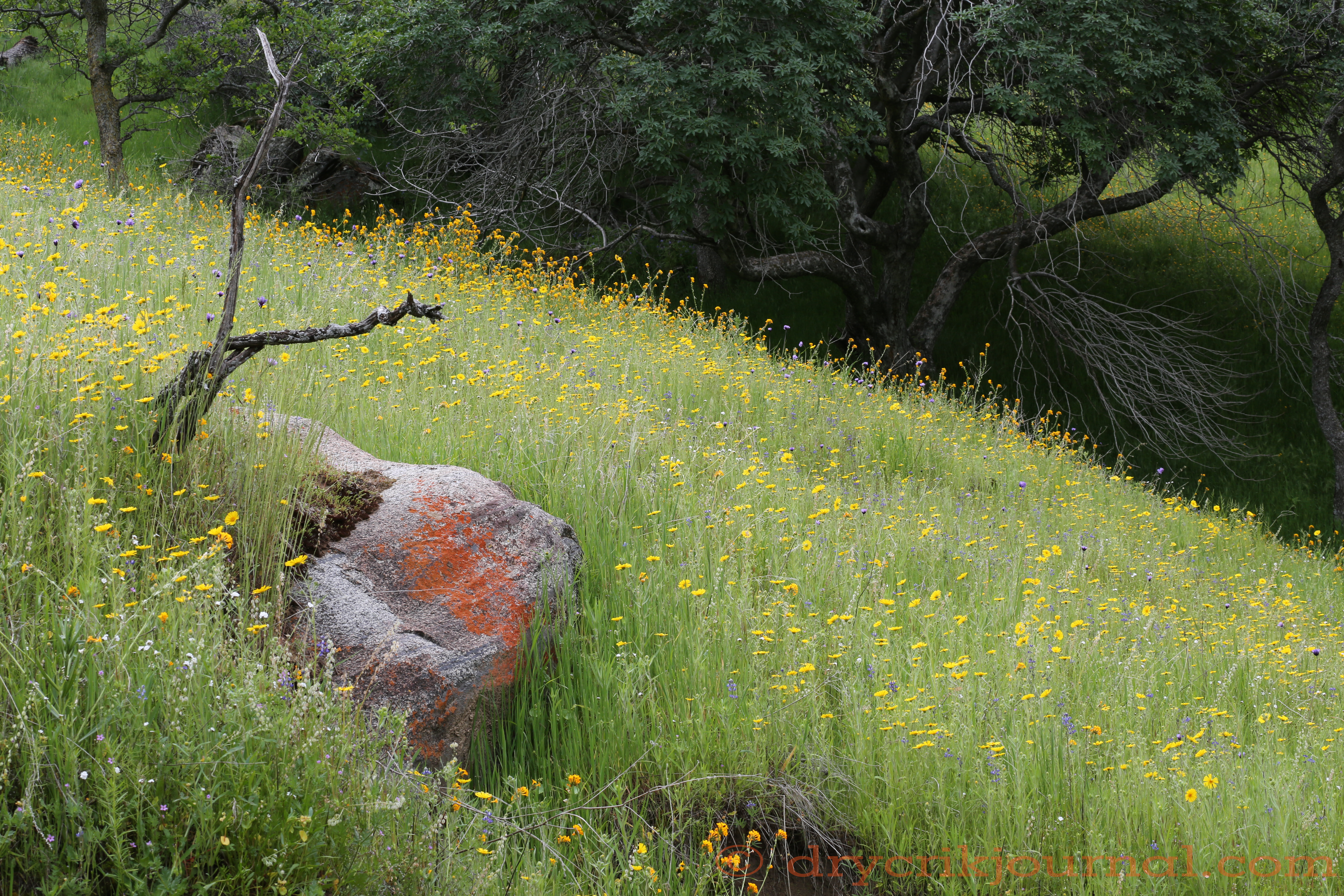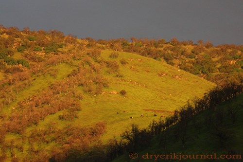 Robbin, Bob, Terri and I went to help our dear friends and neighbors get their calves marked as we’ve done for years. It’s a 45-minute drive up Dry Creek Road to the Mountain House and curvy decline down 245 to the corrals, a green, E-ticket ride of crimson redbud blooming and piles of wildflowers spilled like gold coins around every turn in road as the sun breaches the ridgelines—almost a fantasy.
