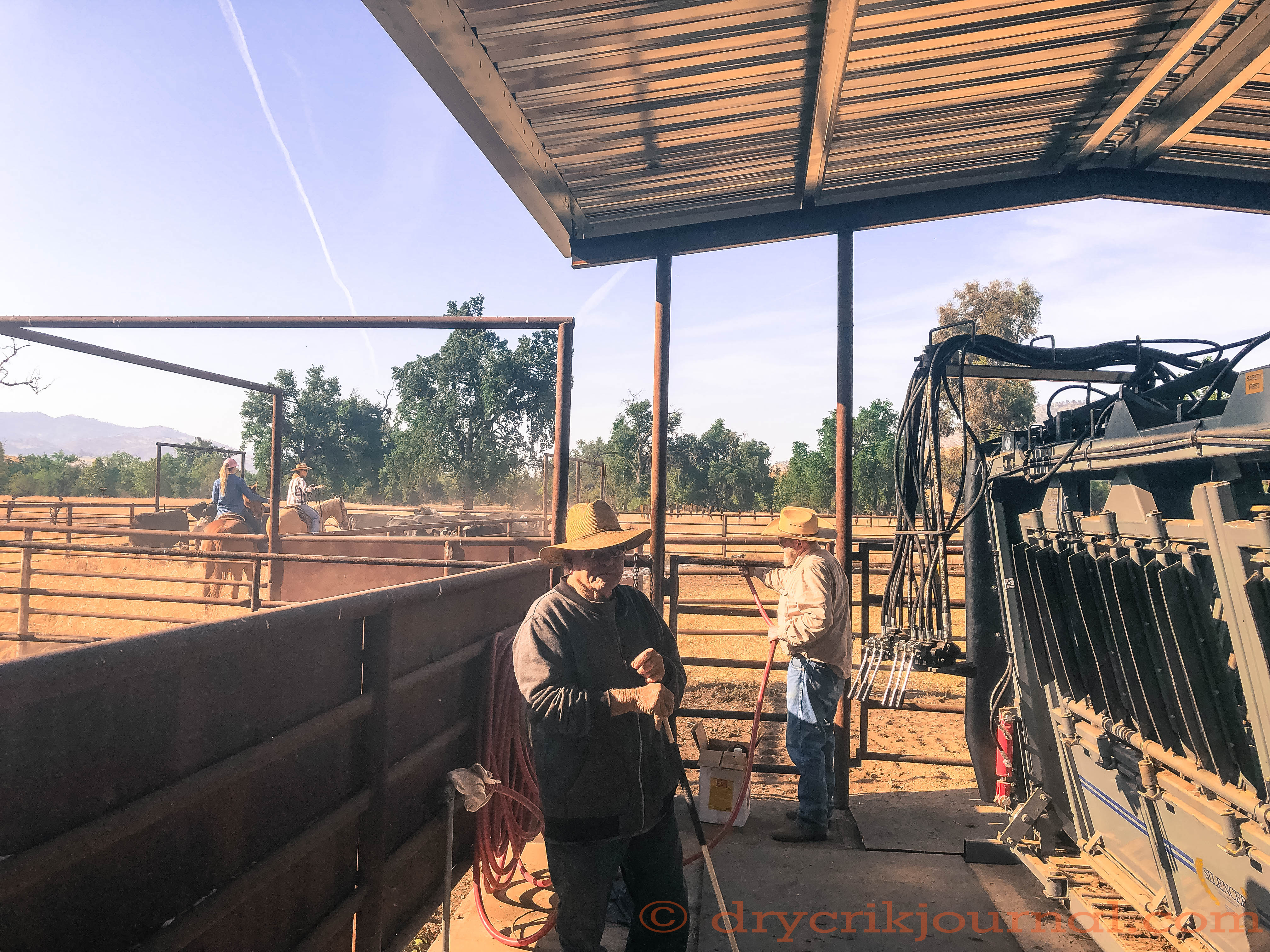 The original board pens were old when they were moved here in 1959 to accommodate the construction of Terminus Dam. Since the 90s, we’ve slowly replaced the boards with pipe. Two weeks ago, we finished upgrading these corrals with time enough to electrify the covered working area for the hydraulic chute and scales. We needed facilities to efficiently process and ship our Wagyu X calves. No two corral set-ups operate the same, even if copied exactly, as the landscape where they are located seems to be a factor in cattle behavior.