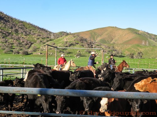 We saddled in the dark and drove up to the Paregien Ranch this morning to haul the calves down the hill to be weaned, a 3 mile, 30 minute, 4-wheel drive one-way pull off the asphalt from 700 feet to the 2,600 foot elevation. Terri, Allie and Robbin got the cows and calves to the old corrals at sunup to sort the cows from their calves. Nice, smooth sort. We had to lighten our gooseneck loads to about 7,000 lbs., instead of 10,000 lbs., because of this year’s slippery dry grass on the roads. But safer to make the extra trips than to lose a pickup and gooseneck, not to mention calves, or to get someone hurt.