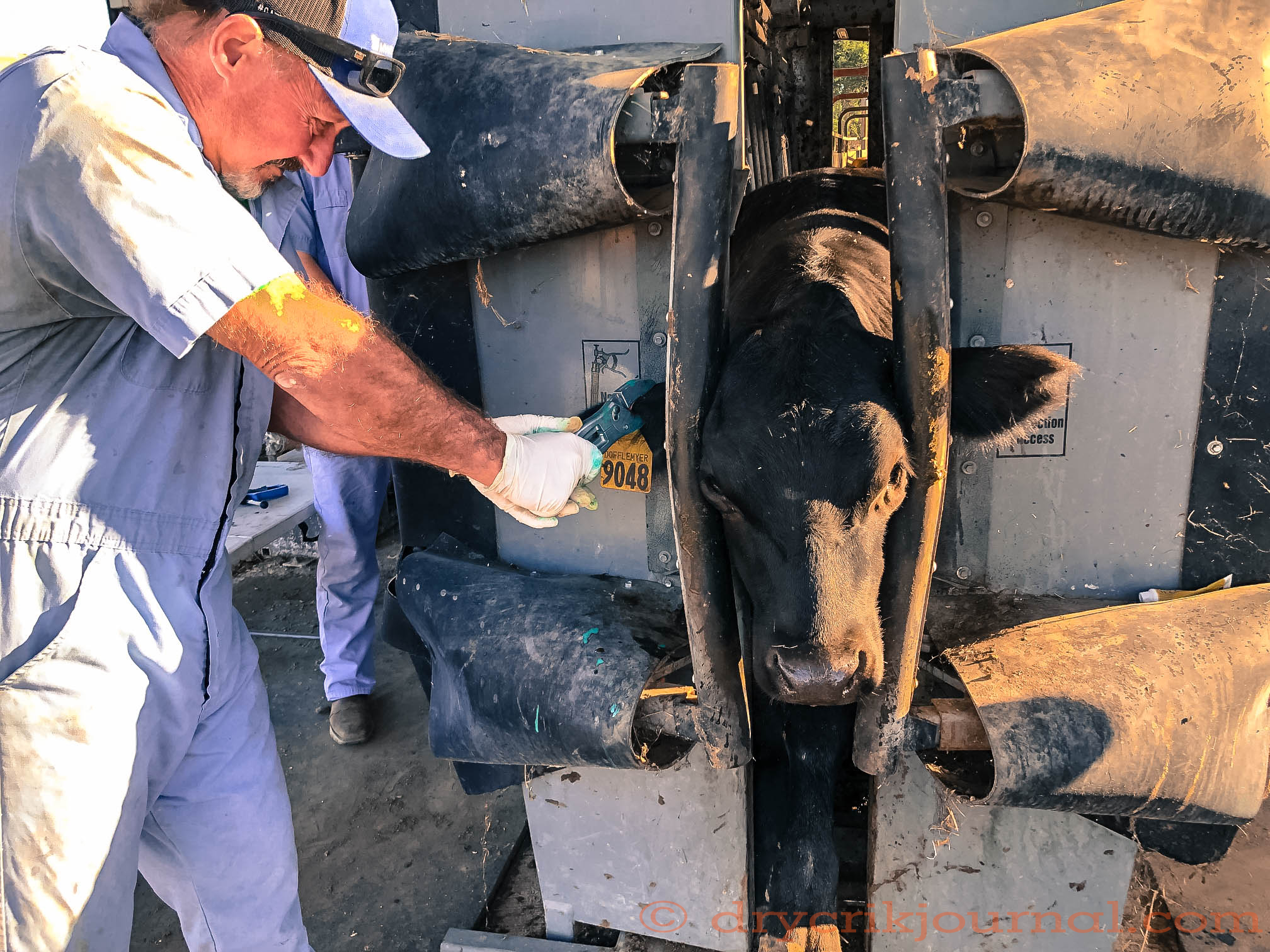 The calves must be vaccinated by an accredited veterinarian who also places a tattoo inside the calf’s right ear and an individual metal ID tag in the same ear. Because we want to limit the stress of cattle-handling on the calves, we use this procedure to revaccinate, a booster to help protect against respiratory and clostridial problems. And while in the squeeze chute they also get a dewormer and a shot of minerals.