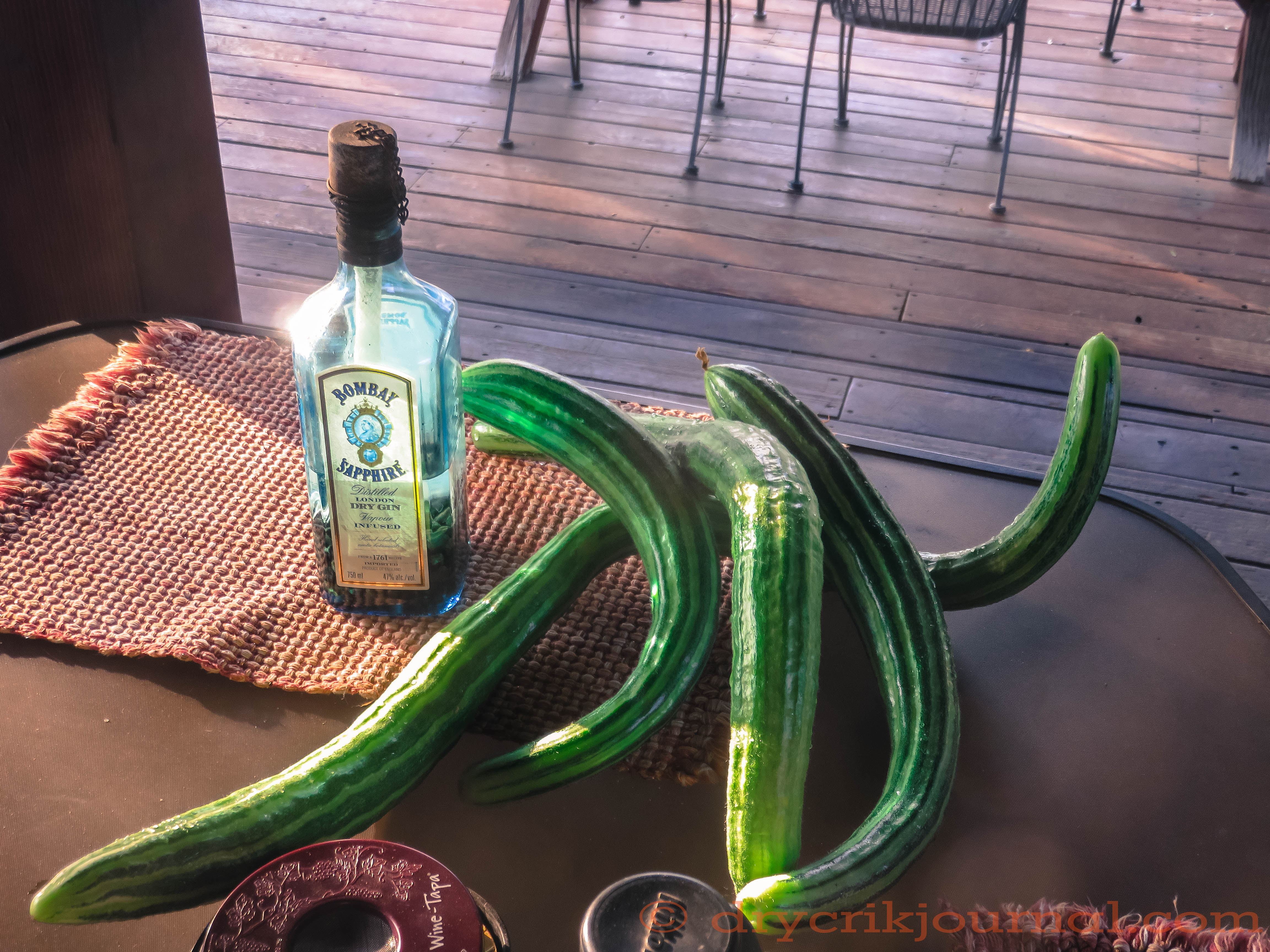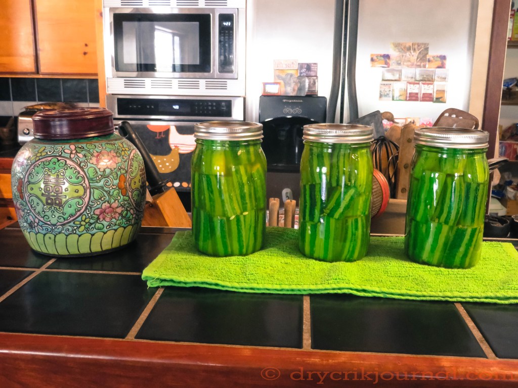 Robbin brought in and armload of (4) Striped Armenian Cucumbers early this morning that neither the rabbits nor squirrels have bothered this summer. More work, of course. This will be her umpteenth batch of crunchy dill pickles. The Bombay bottle has found a second life, filled with citronella now to deter the flies.