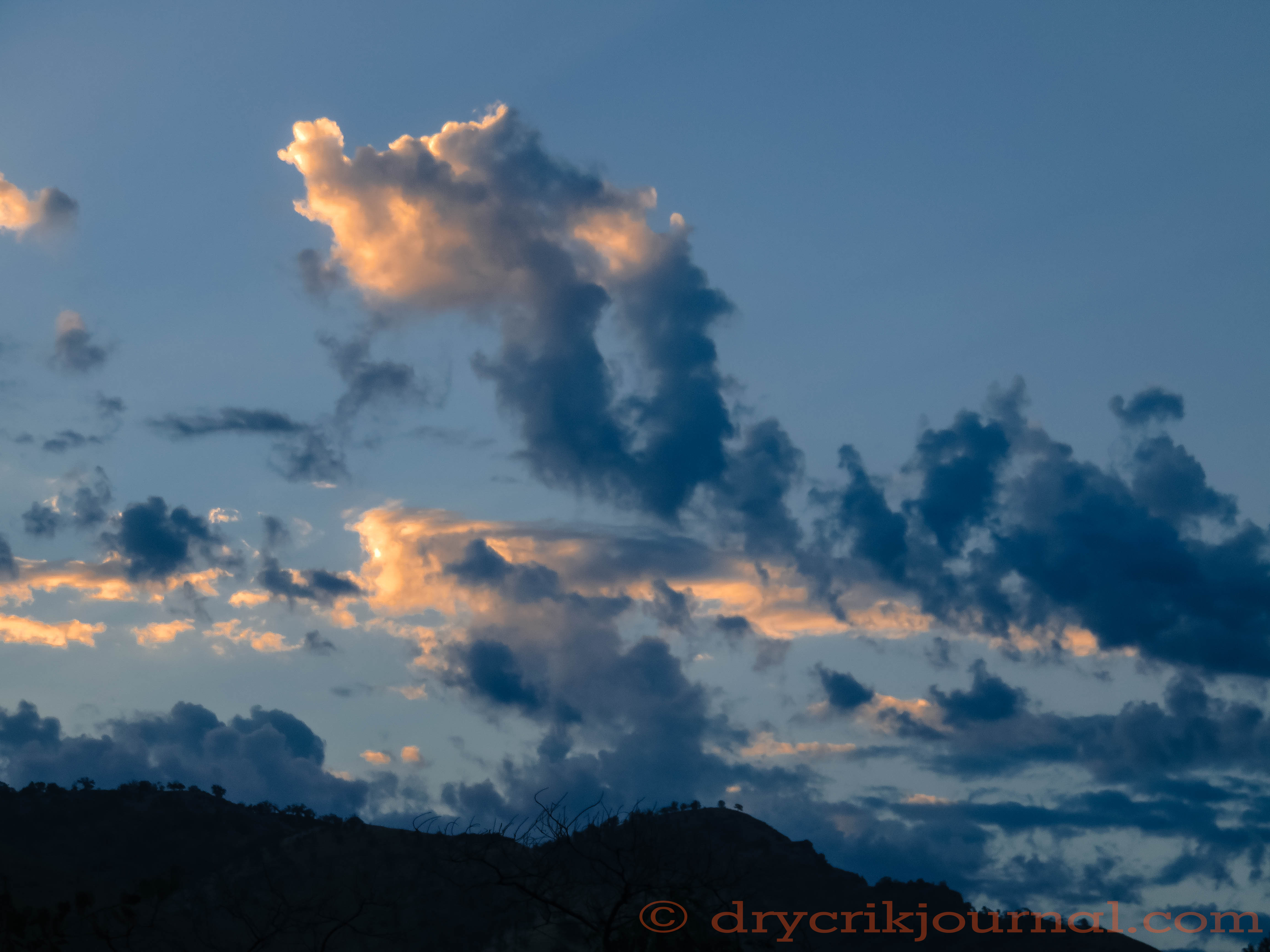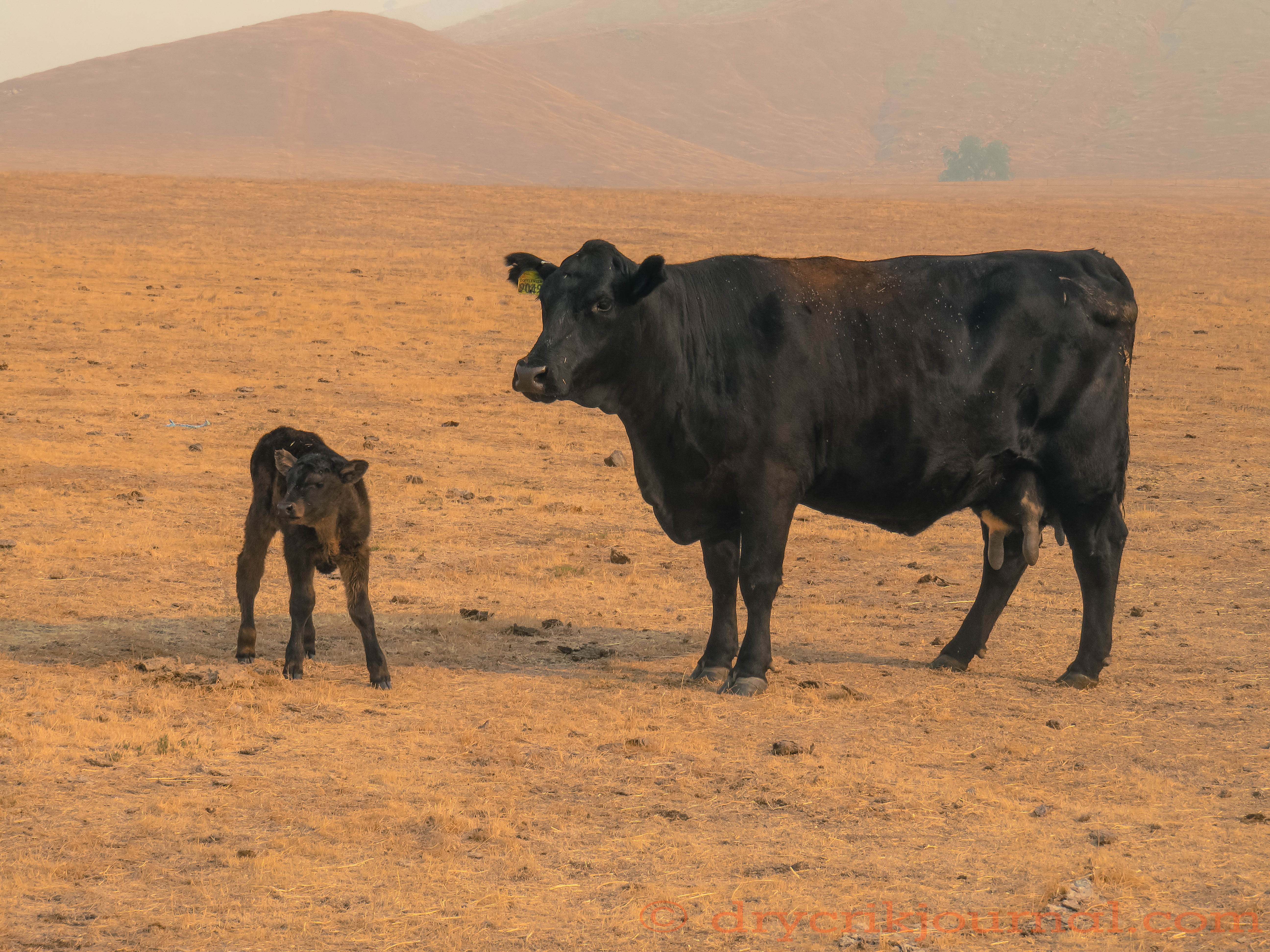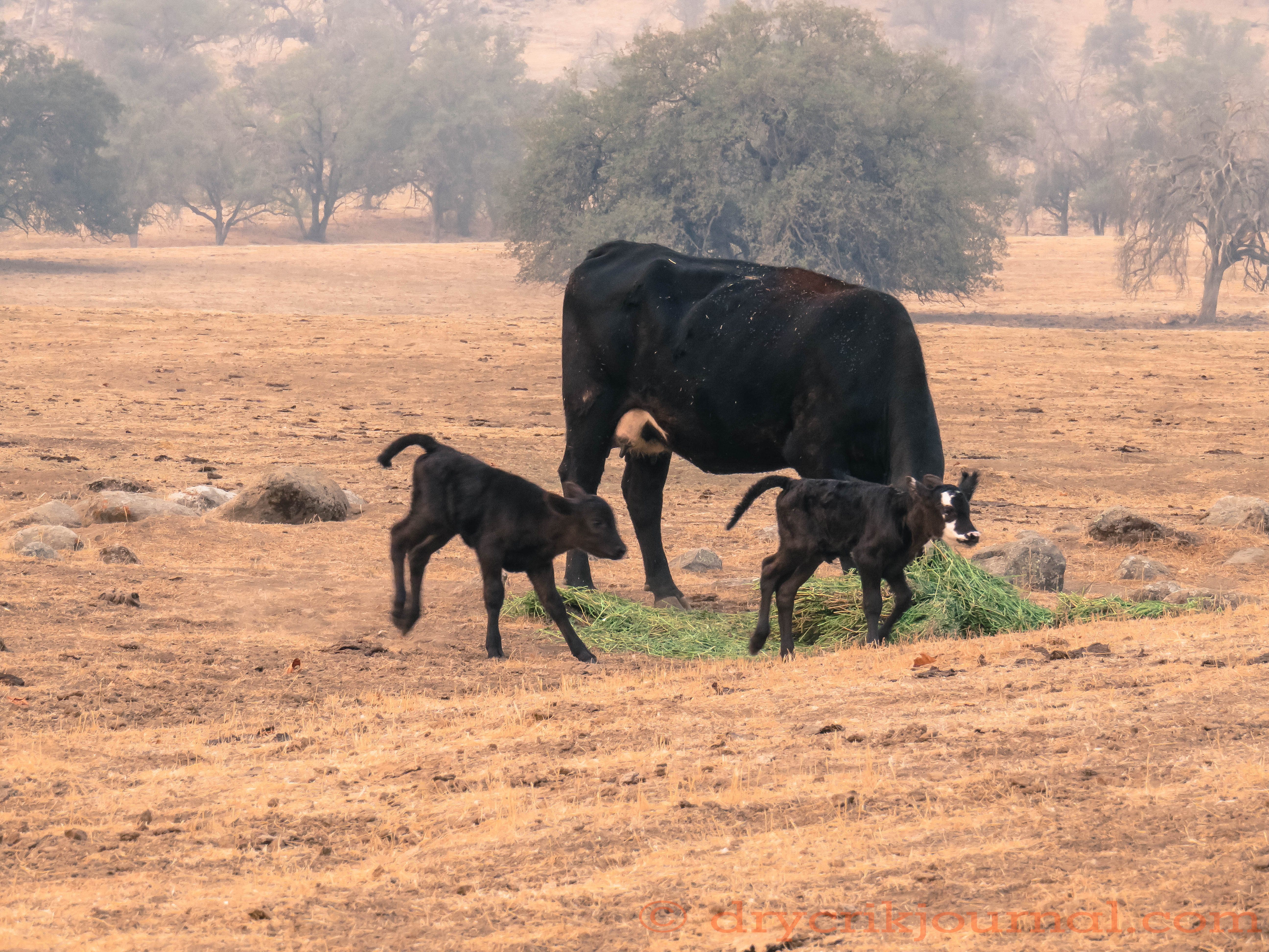 Usually twin calves for a young cow is a curse, wherein most cases she abandons the weaker one. If she tries to raise them both, it typically taxes her so much that her poor shape keeps her from cycling to breed back. By themselves near the house this morning, I took out some alfalfa while the rest of the cows were still on the hill. Here the calves are playing while she has an early breakfast in our fourteenth straight day of smoke from the KNP Complex fire in Sequoia National Park and Forest.