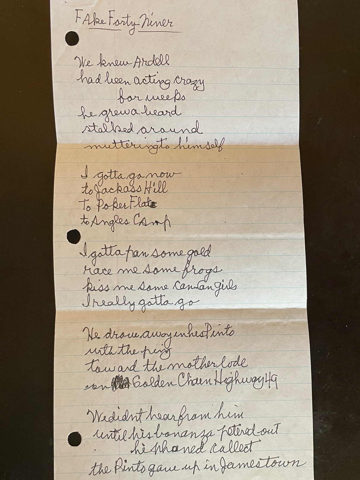 I gotta go now to Jackass Hill to Poker Flat and Angels Camp