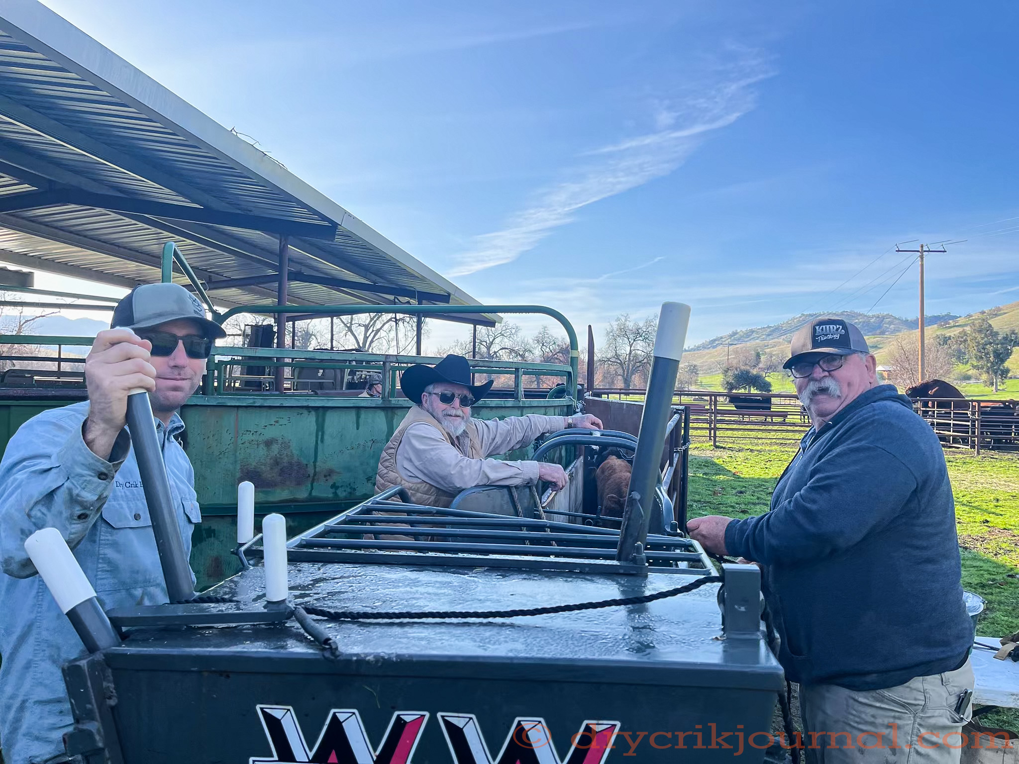 I was weaned on a copy of the Teco calf table and my job at six or seven was to push the calves up a narrow chute through the sliding gate to the table. My dad was on one side and Clarence Holdbrooks on the other. Clarence would catch the head and squeeze the body of the calf, and then tip the table into a horizontal position. My dad would put a rope around the back feet of the calf and stretch them tight to make it immobile so the bull calves could be castrated and all the calves branded, vaccinated and ear marked. Once done, the table would be tipped to a vertical position and the calf released. The three of us, two men and a boy, would brand 50 head in about 2 hours.