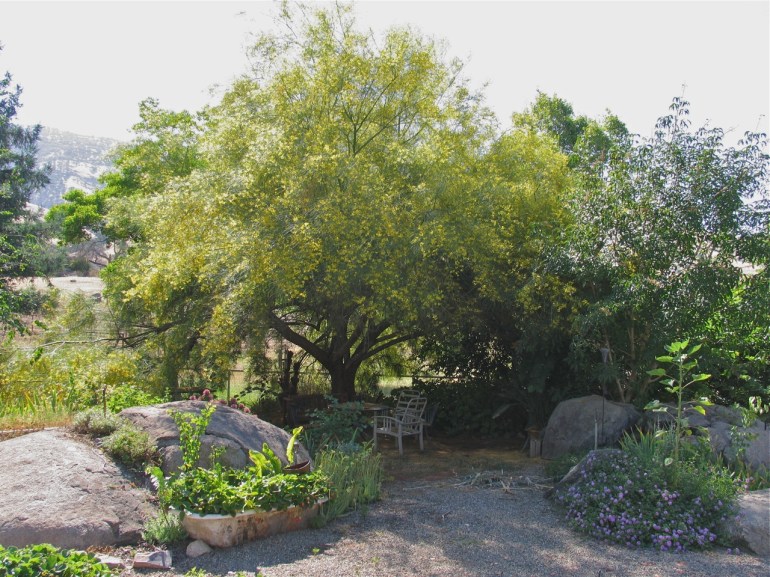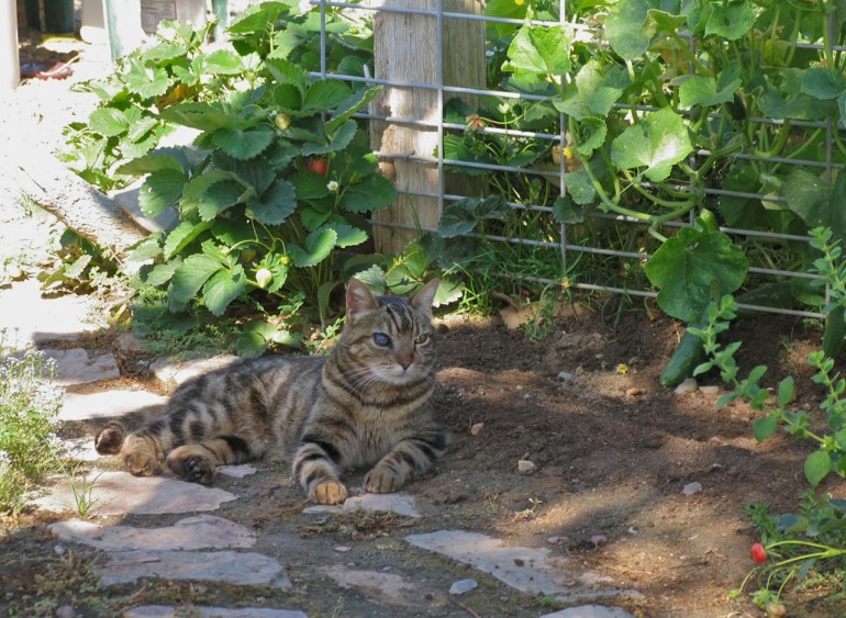 With warmer weather, the garden is still producing strawberries, and Robbin, strawberry jam when she finds time. We’ve begun picking squash, peppers, cucumbers, onions, potatoes as needed, tomatoes ripening. Always attractive to the birds and bees, sunflowers volunteer, somewhere, from last year’s seed. With ample rains and bloom, we’ve lost a limb on the Palo Verde. One-eyed Foreman, our old cat, accompanies Robbin when in the garden, scouting for snakes in the squash and strawberries.
