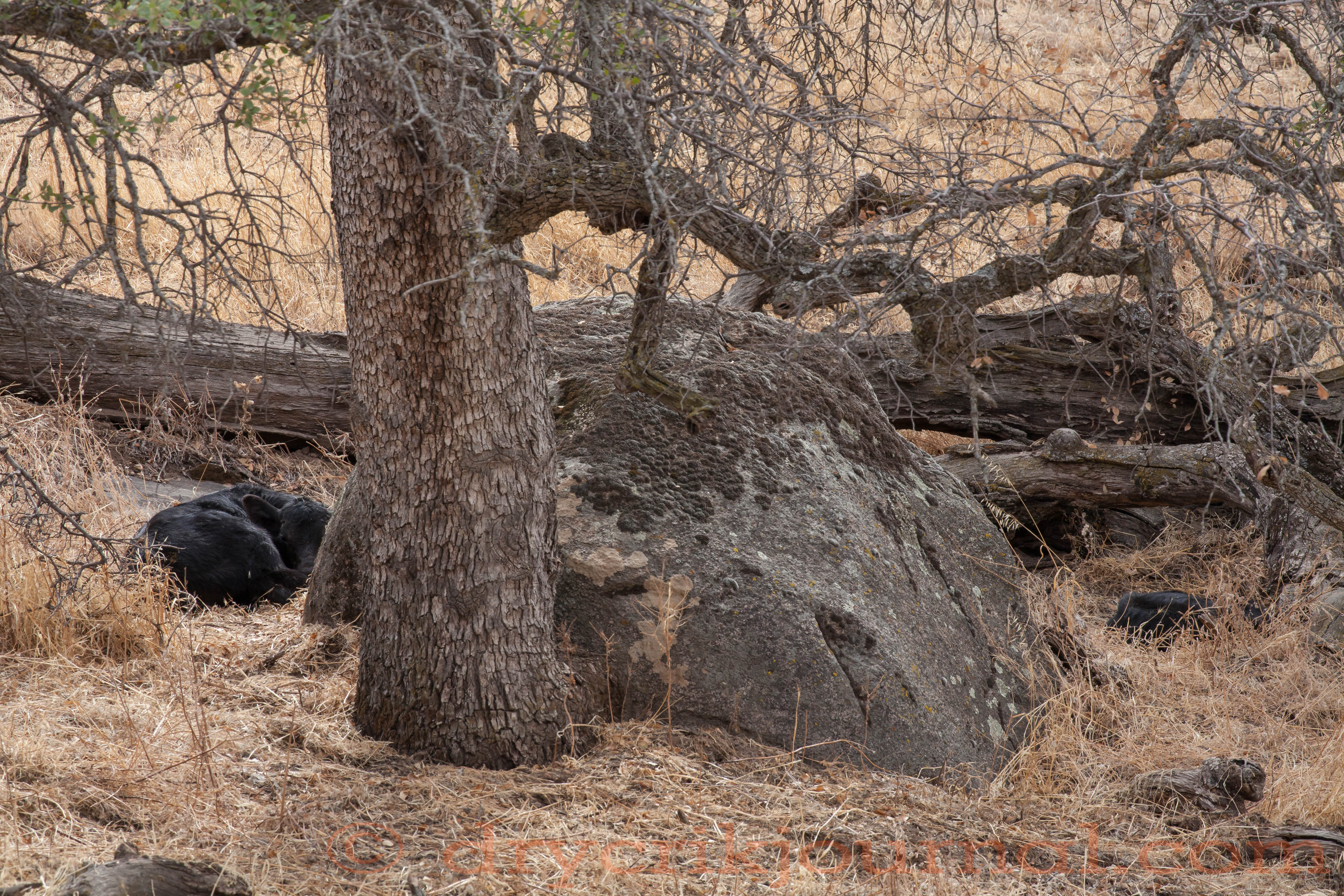 While calving, our cows are well aware of the recent influx of bears, displaced in part by the 150,000 acre Rough Fire in Kings Canyon, but primarily due to the drought and the lack of anything to eat at the higher elevations. Furthermore, there’s not much here to eat either, as only one in three or four hundred oak trees has any acorns and the percentage of oak trees that have died because of the lack of rainfall the past four years continues to increase and probably approaches 40% now. The remainder have lost most of their leaves, but there’s bear sign everywhere we go.