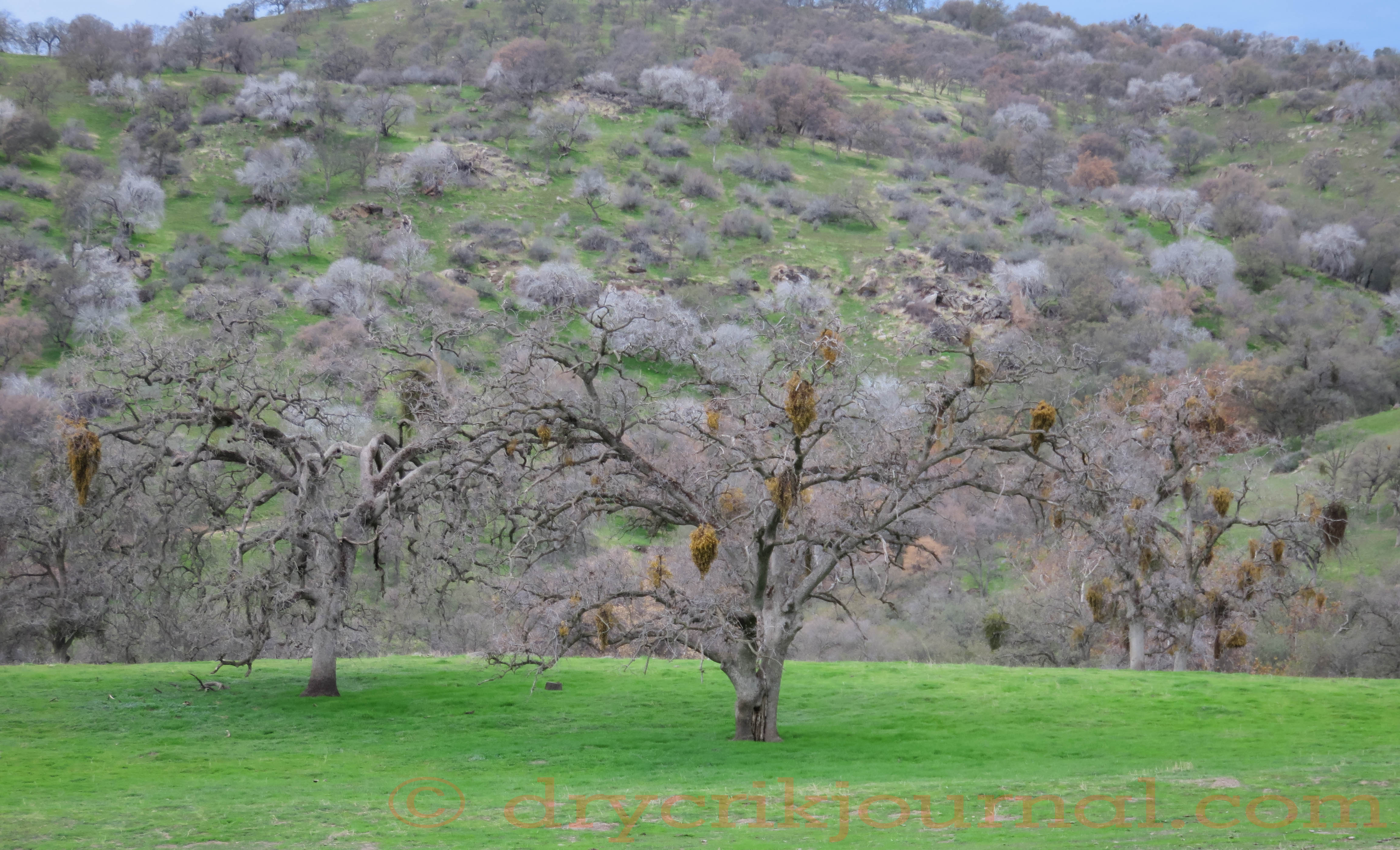 While calving, our cows are well aware of the recent influx of bears, displaced in part by the 150,000 acre Rough Fire in Kings Canyon, but primarily due to the drought and the lack of anything to eat at the higher elevations. Furthermore, there’s not much here to eat either, as only one in three or four hundred oak trees has any acorns and the percentage of oak trees that have died because of the lack of rainfall the past four years continues to increase and probably approaches 40% now. The remainder have lost most of their leaves, but there’s bear sign everywhere we go.