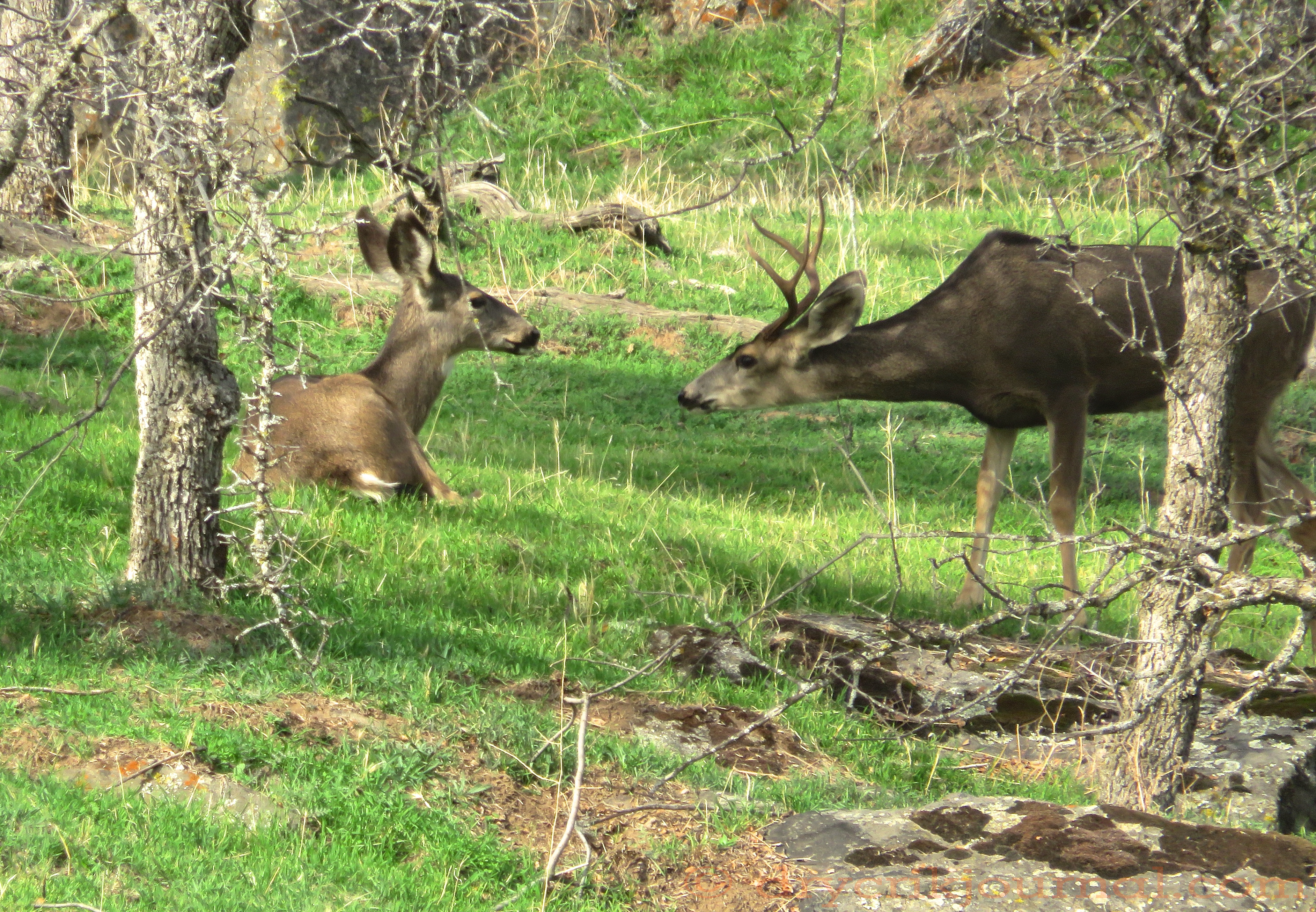 Yesterday, Robbin and I were checking the cows and calves on the Paregien Ranch while putting salt and mineral out when we ran into these two bucks and some does. Because they don’t get much hunting pressure and familiar with our comings and goings, the deer are fairly tame. Add the bucks’ tunnel-vision this time of year and it’s as if we weren’t even there. Robbin took the video from her cell phone.