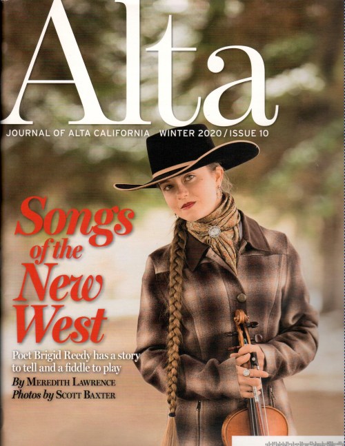 What a great surprise to see Brigid Reedy on the cover of Alta Magazine, Journal of Alta California. Accompanying her in this issue are also perspectives from my good friends Amy M. Hale (Auker), Ramblin Jack Elliott, Andy Hedges and Don Flemons to round out “The Herd Word” by Meredith Lawerence, a tribute to the National Cowboy Poetry Gathering.