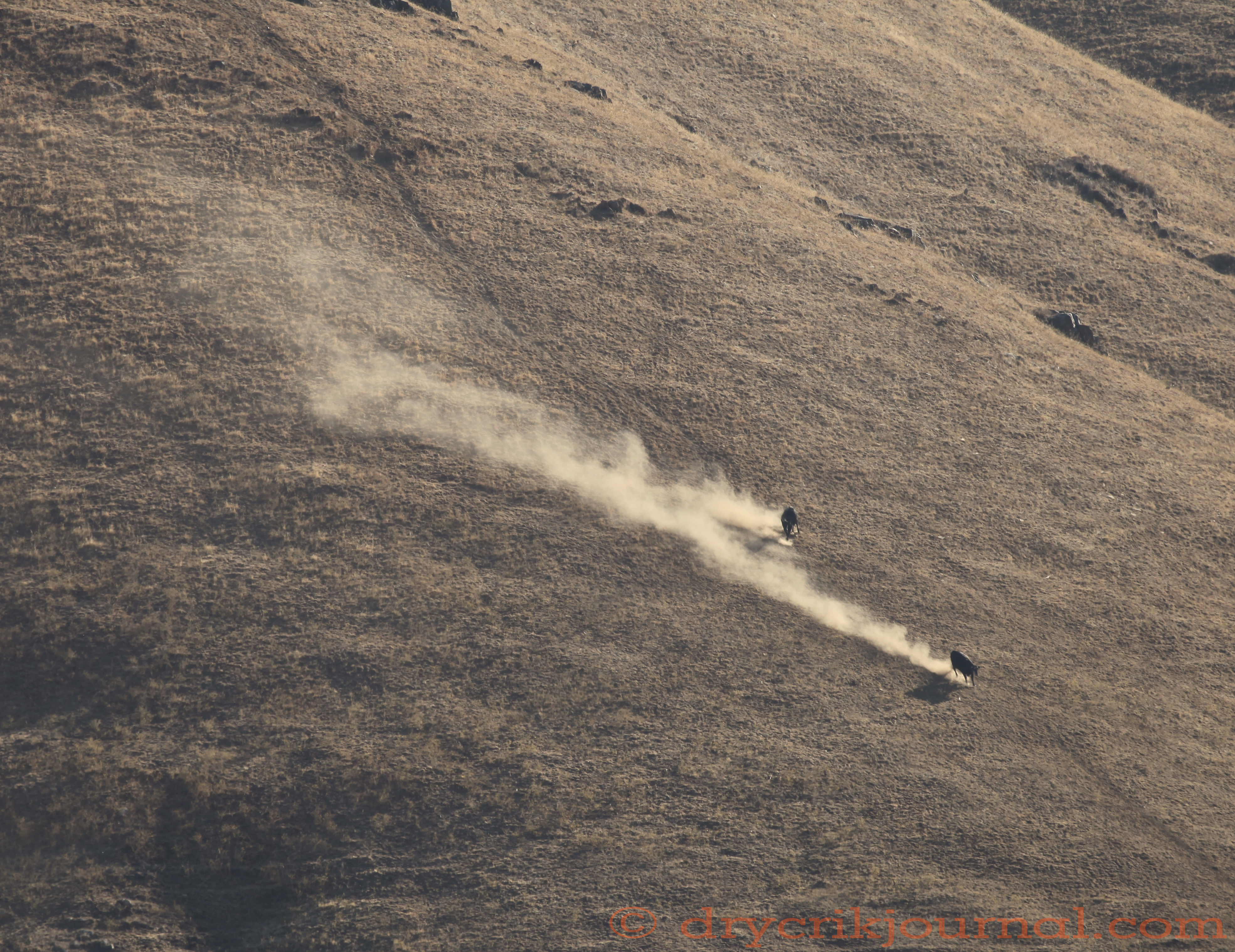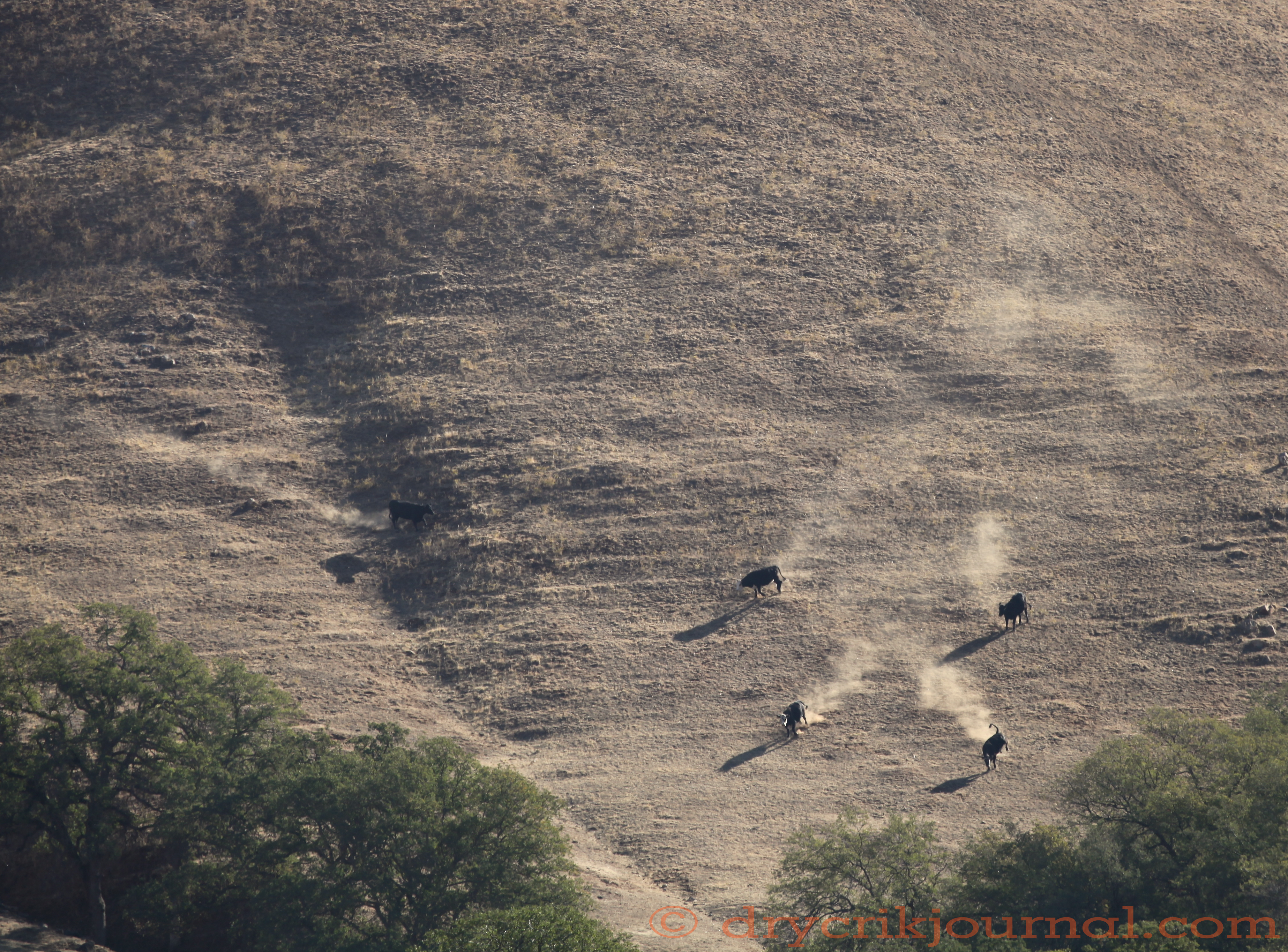 According to the clock, Robbin and I got off to a slow start feeding hay to our first-calf heifers, lollygagging over coffee outside in the mid-50s. At the solstice, the sun broke the ridge two hours earlier and pushed 90°at 9:00 a.m. No urgency today in the cool, especially with a bunch of the heifers still grazing the top of the ridge across from the house. Fooling around a little longer, I got the big lens out while the last of these would-be mothers ran off the mountain, just having fun.
