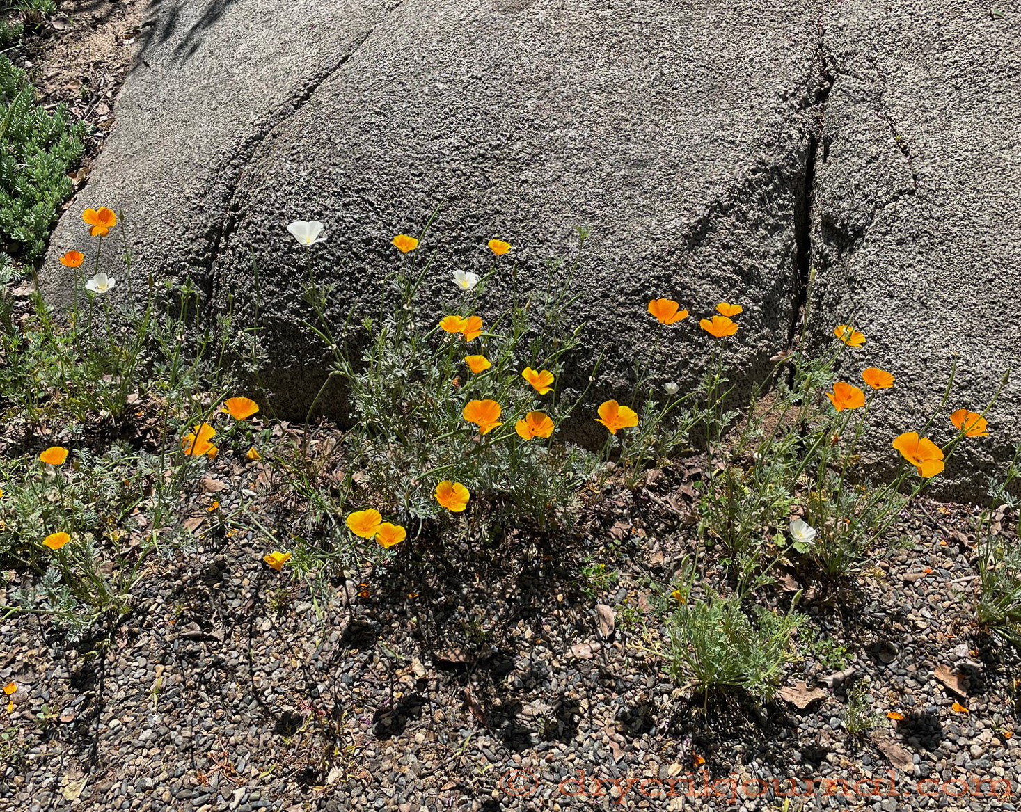 After four days in the 70s, 10 degrees above average, the wildflowers are popping everywhere. These across the creek from the house may be only the beginning, white popcorn flowers following suit. Stay tuned.