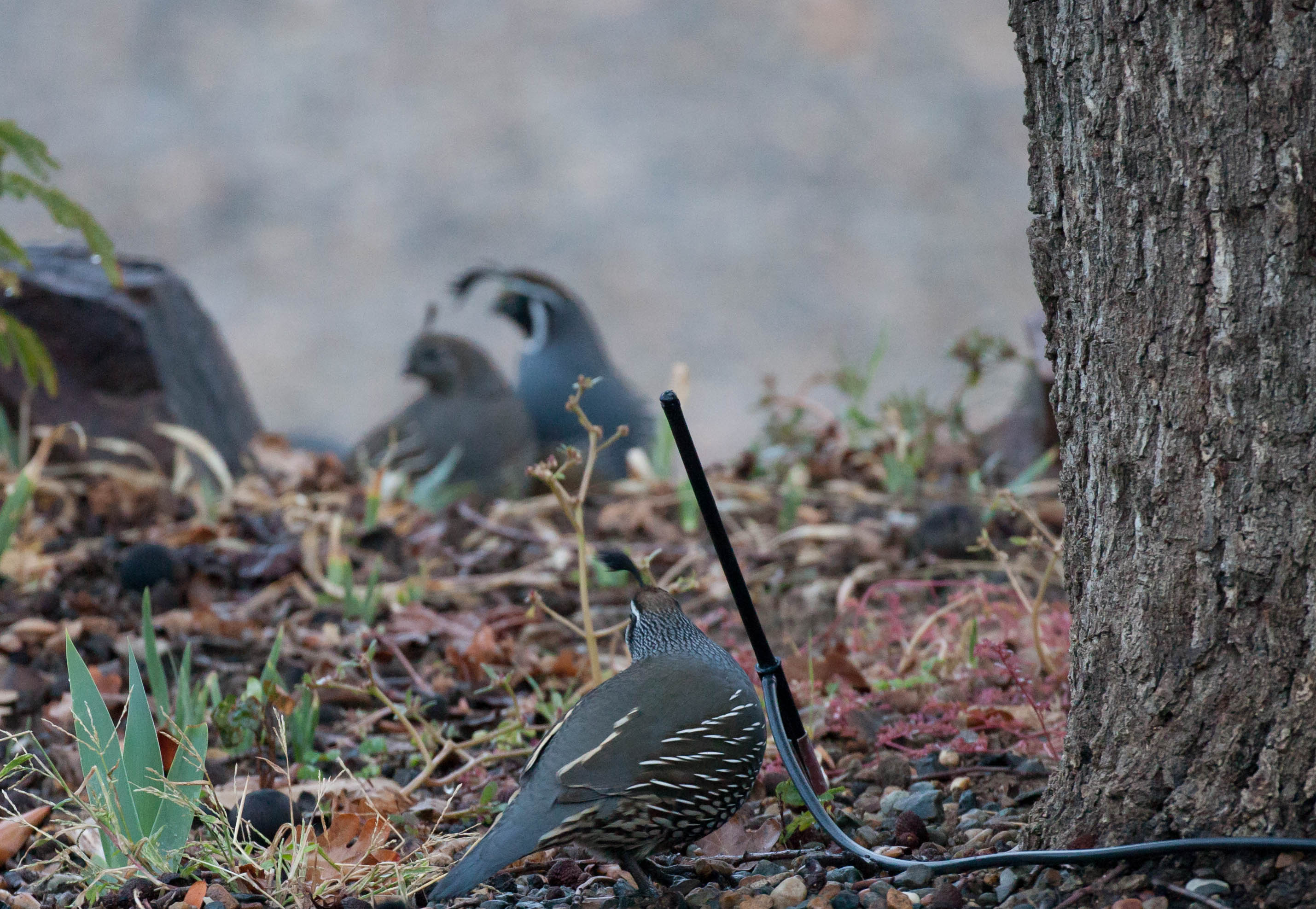 For the past month or so, the morning routine of the covey is to leave the Palo Verde tree where they spent the night, to go through the garden and stop beneath the Blue Oak for a snack, then parade across the yard to the Valley Oak, their tree of choice, for their main course. They seem to be coming to breakfast earlier, or perhaps the woodpeckers are sleeping in, but they haven’t been harassed lately as our temperatures drop to around 40°.