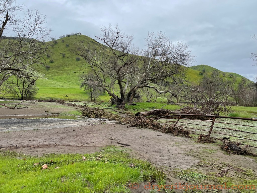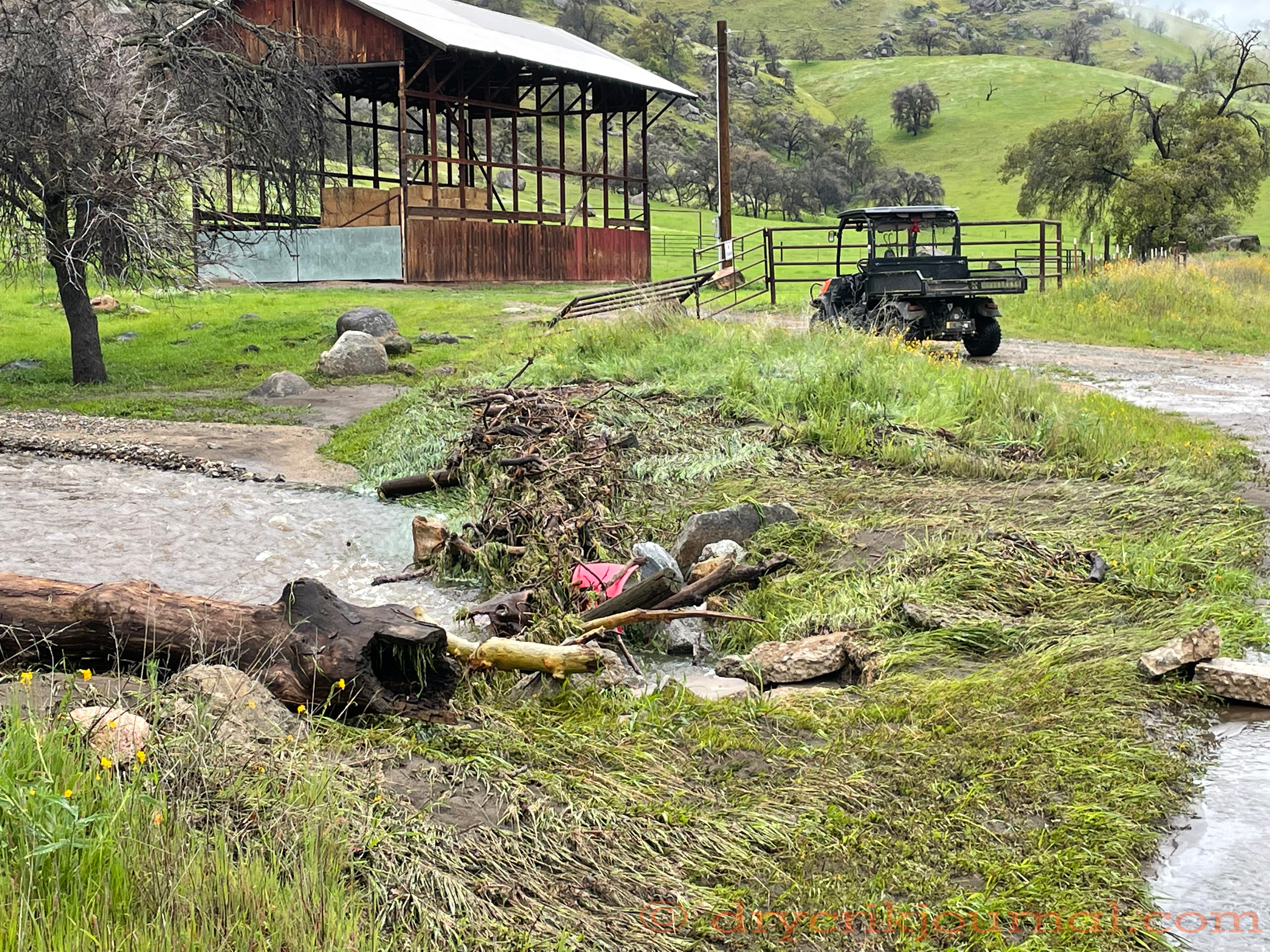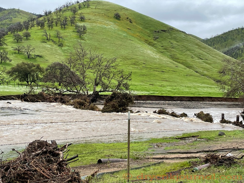 Lots of hillside sloughing on Dry Creek Rd, plugged culverts everywhere. Road closed. Greater damages to surrounding roads and small towns, Woodlake, Exeter, Elderwood.