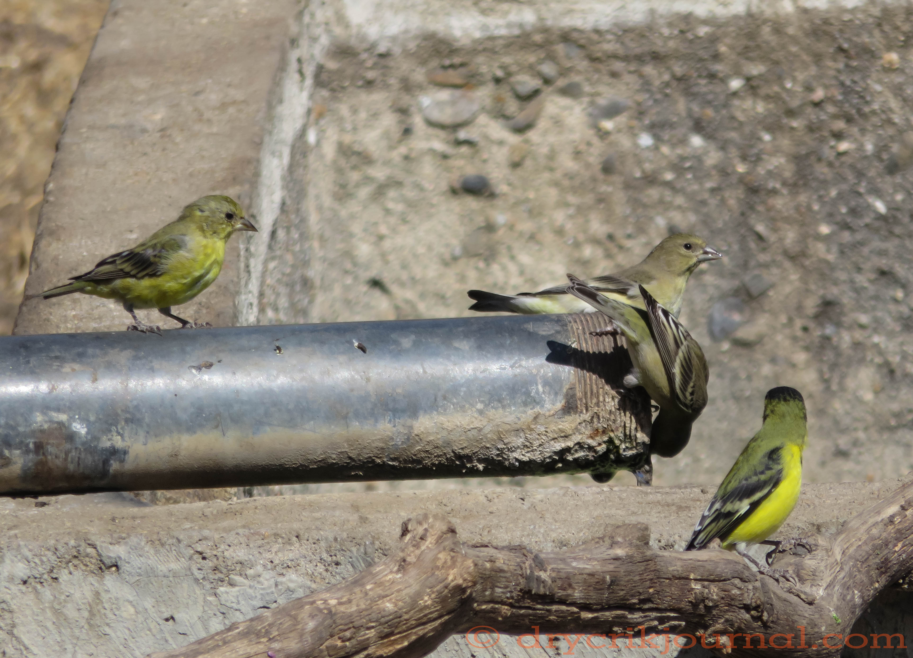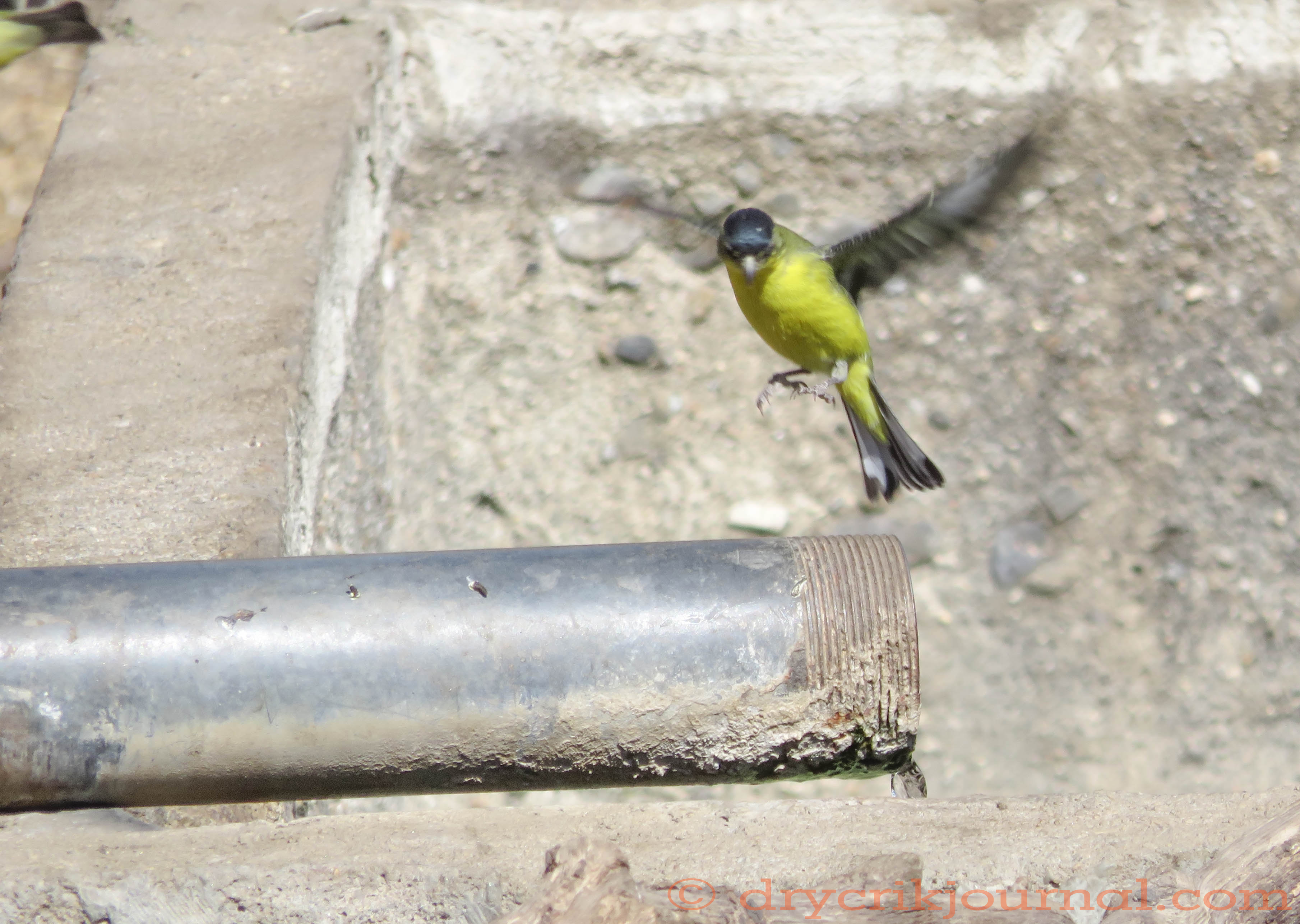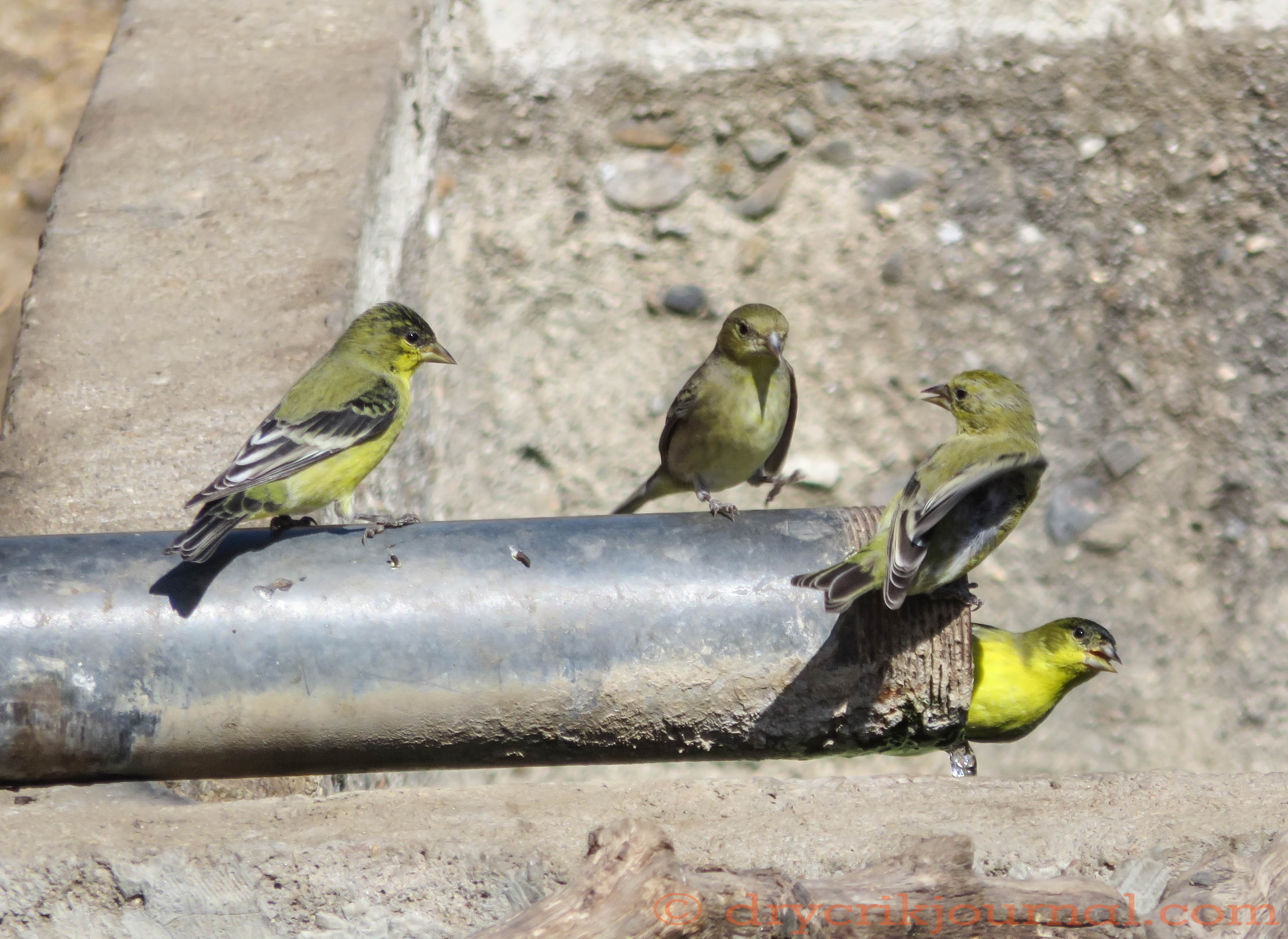 When Terri and I fed last Wednesday, she asked about the yellow birds flying out of the tank that I missed seeing. But when I looked into the tank, a pair of Pine Siskins (Goldfinches in camouflage) flew off a floating board. With the board removed Saturday, the birds have had to improvise. The first and last photos are Goldfinches in winter plumage, Pine Siskins and an unknown in between, but I defer to Avian 101 or other authority to verify the identity of both species.