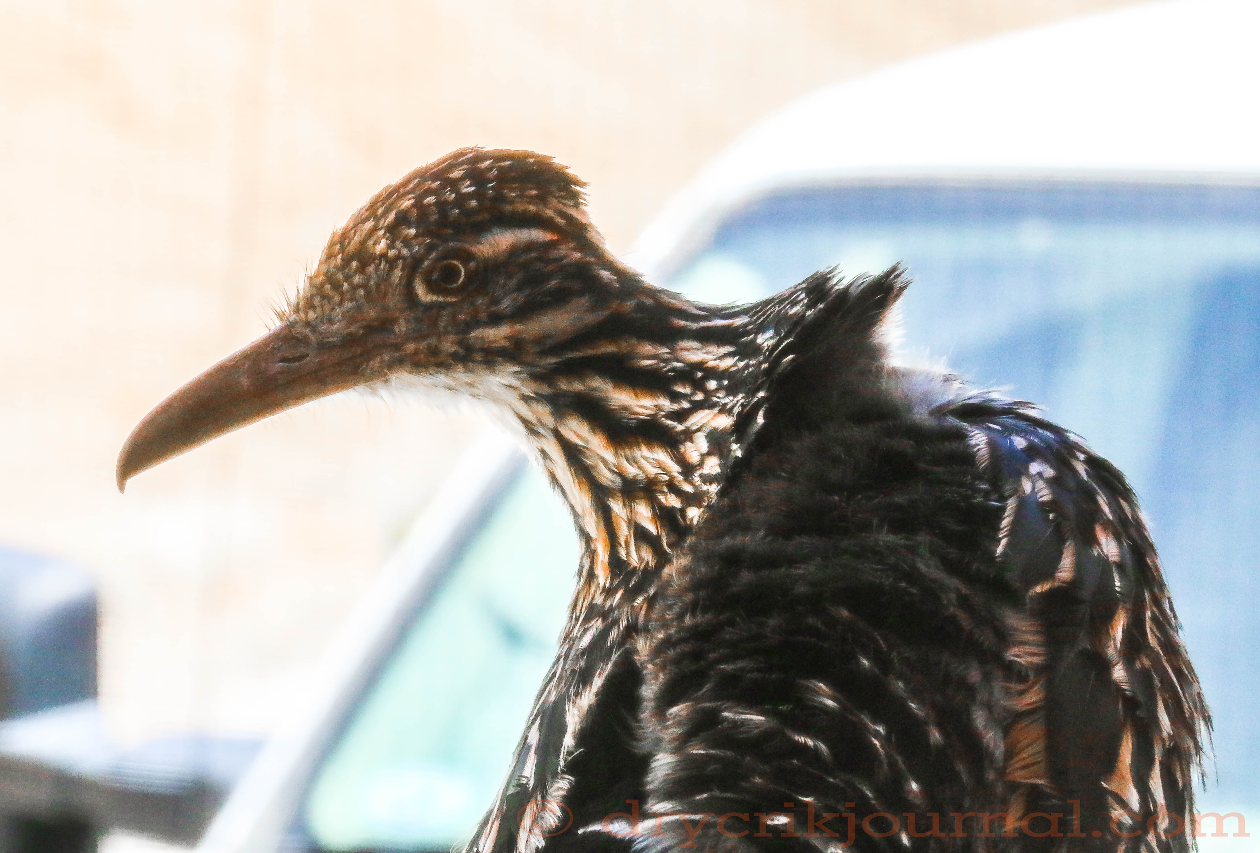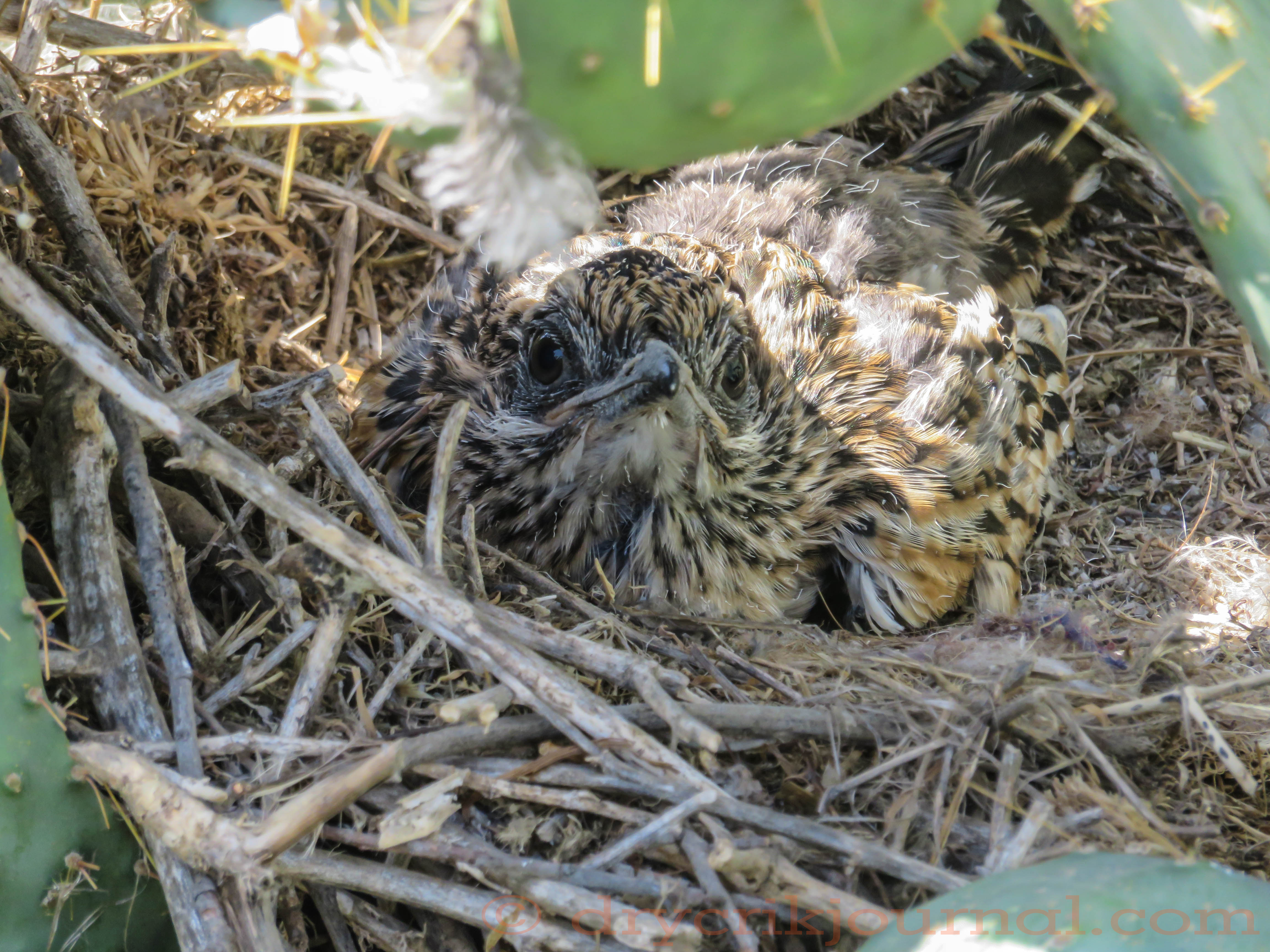 Begging your indulgence for yet another photograph of the Roadrunners, an adult and juvenile, hanging around the cactus nest where one fledging remained yesterday afternoon as I came in the driveway.