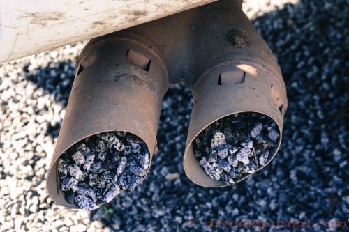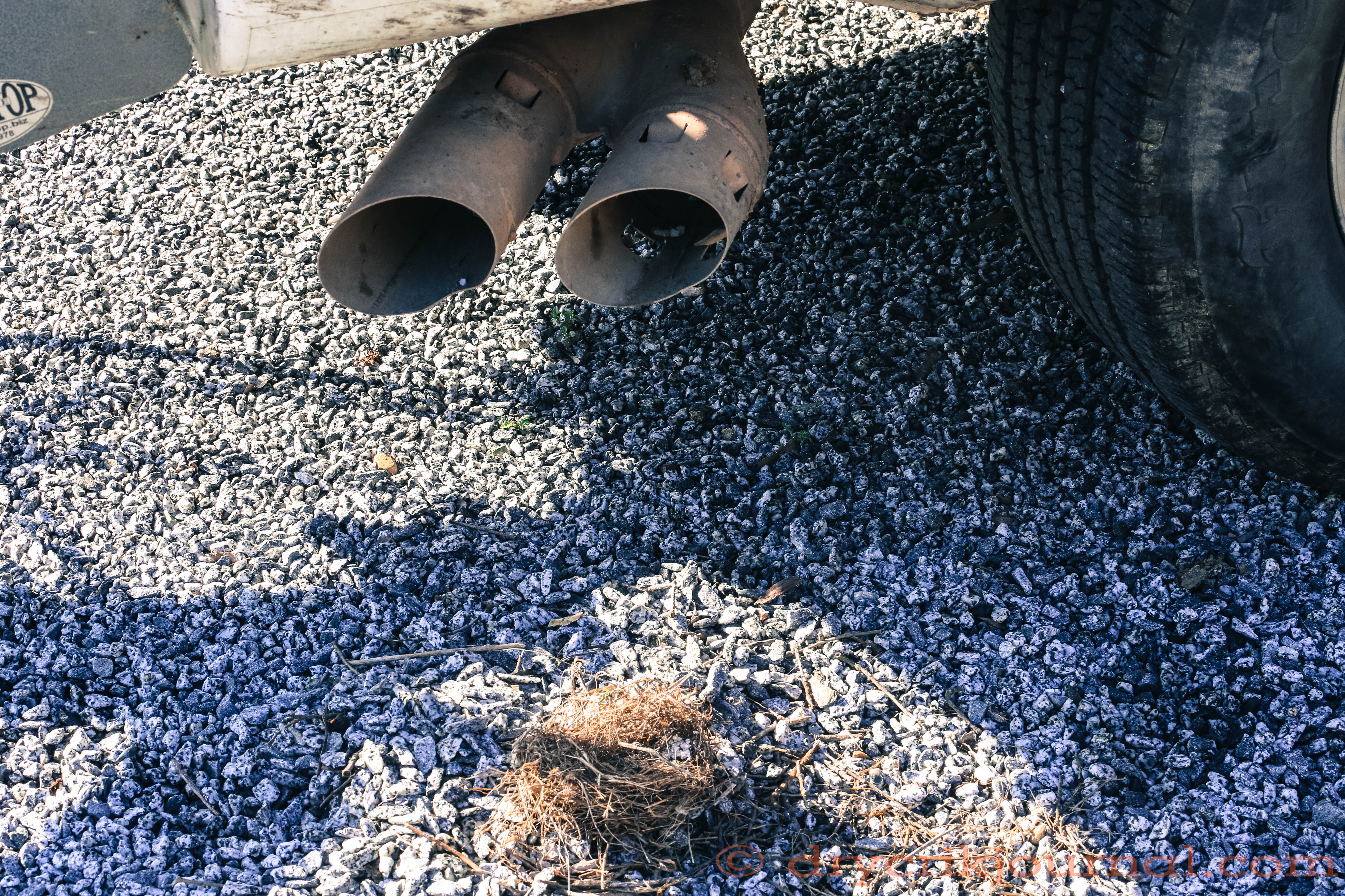 Though we removed the pack rat nest, gravel continued to build up in the exhaust pipes, and another nest removed that contained an egg and eggshell remains. Beginning cattle work, I often leave the gooseneck hooked-up to my pickup and park it elsewhere for several days in a row. We then noticed that exhaust pipe of Robbin’s car was acquiring several gravel stones of its own.