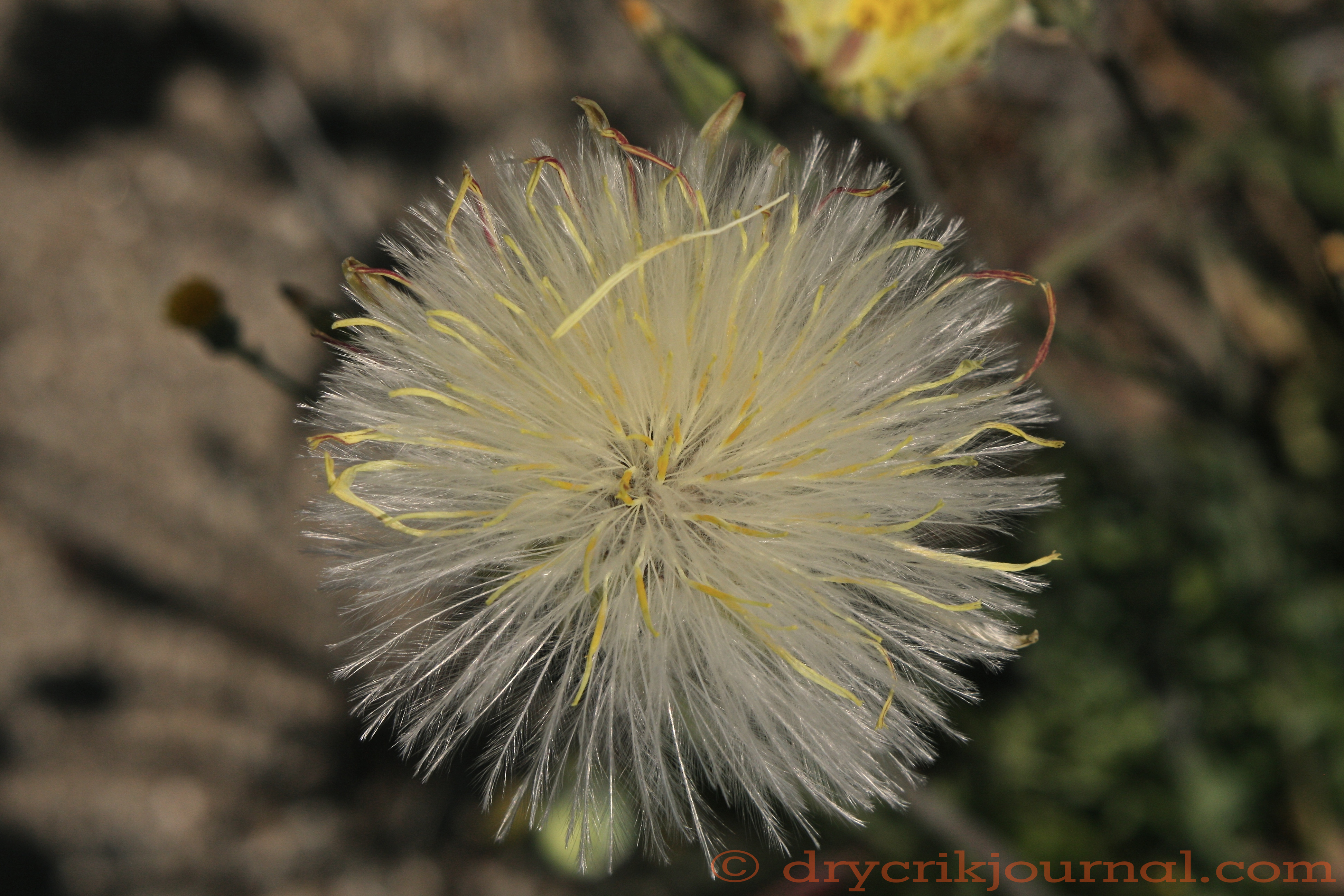 Not a colorful year for wildflowers, I was surprised, while setting my irrigation water yesterday, to pass a pastel-yellow family of Scalebud Anisocoma acaulis on a sandy, south-facing slope, well-off the easement road to Terminus Dam.