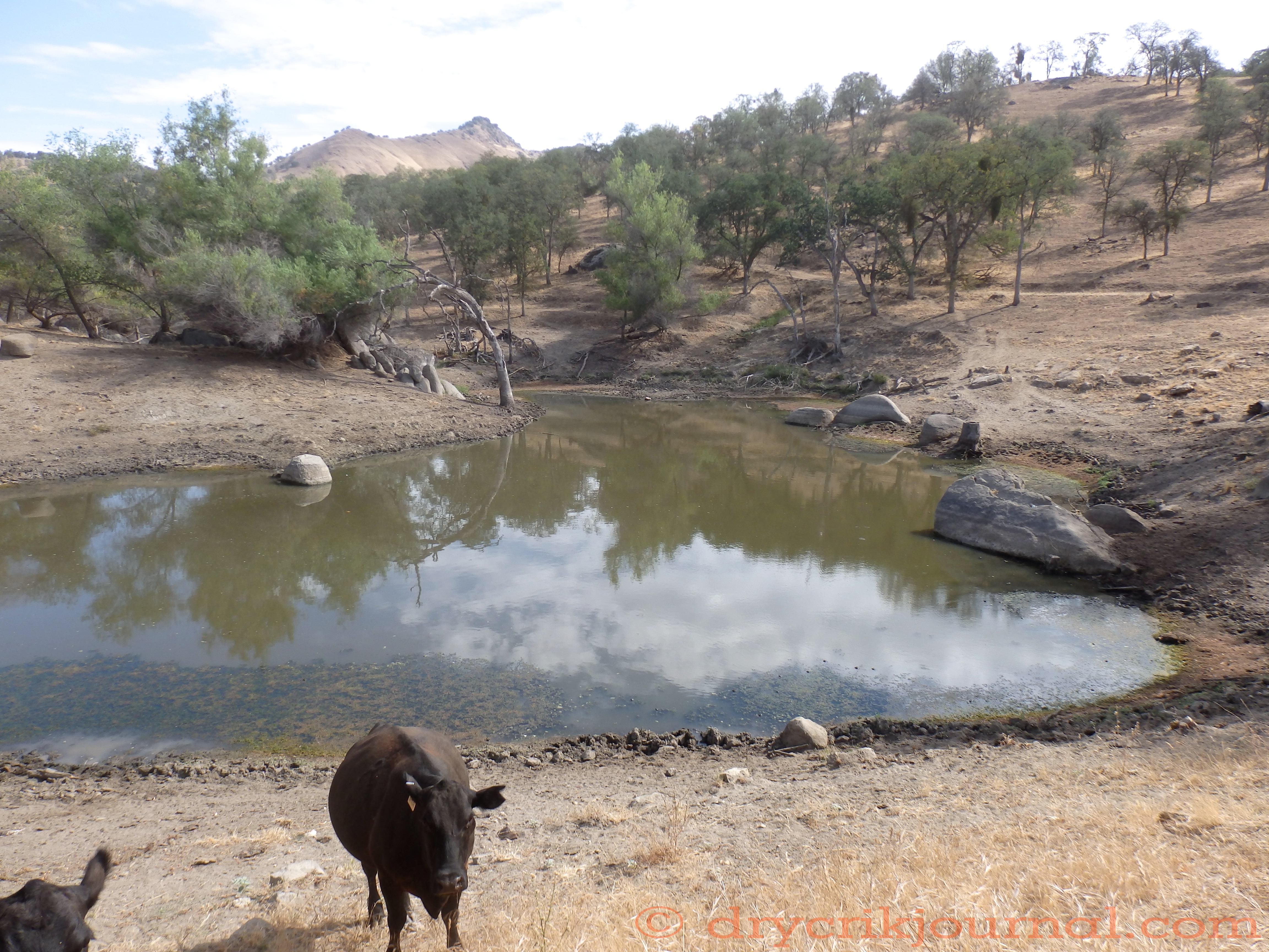 and like the pond at Spanish Flat, it may or may not last until fall. We opened the gate between our Lower Field and the Gathering Field to allow access to more water for the cows in the Lower Field, taking the pressure off Greasy Creek and Spanish Flat.