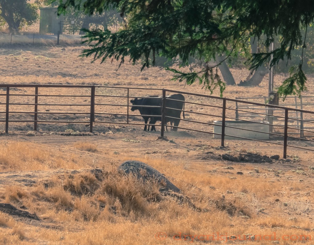 We let our big dog Buster, a Great Pyrenees/German Shepard X that was part of the litter dumped on Dry Creek Road several years ago, loose to work at night keeping the coyotes, feral pigs, raccoons, skunks, etc. out of the yard. We don’t want him to make a mistake while we’re sleeping, so we move the cattle out before dark.