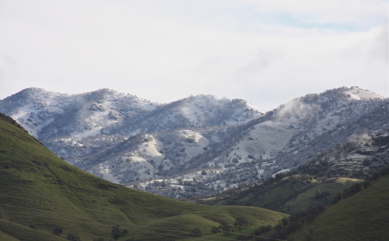 After another all-night rain, the creek is up and snow low enough to close the Grapevine, the Interstate between the San Joaquin Valley and L.A., and Deadwood, the steep and curvy stretch falling-off into Oakhurst where Robbin’s brother operates a snowplow for Cal-Trans. Also Priest Valley, CA 198 & 25 west of Coalinga in the Coast Range is closed. No surprise that a chunk of Highway 1 through Big Sur lies in the Pacific. 1.68 inches of rain in the past 24 hours, 2.22 inches in the last 3 days, and still raining, clouds hanging below Sulphur Peak at 3,000 feet, our ground has not dried out since the middle of last December and more rain forecast for the next ten days.